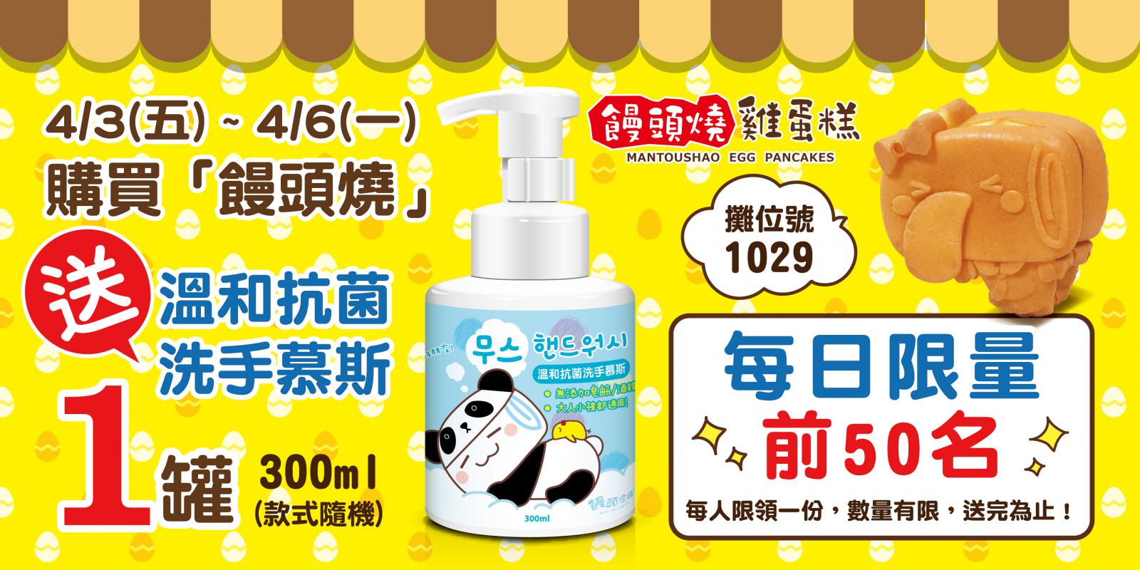 凡於活動期間購買「饅頭燒雞蛋糕」,每日前 50 名消費者即可獲得「品牌質感洗手慕斯」一罐。