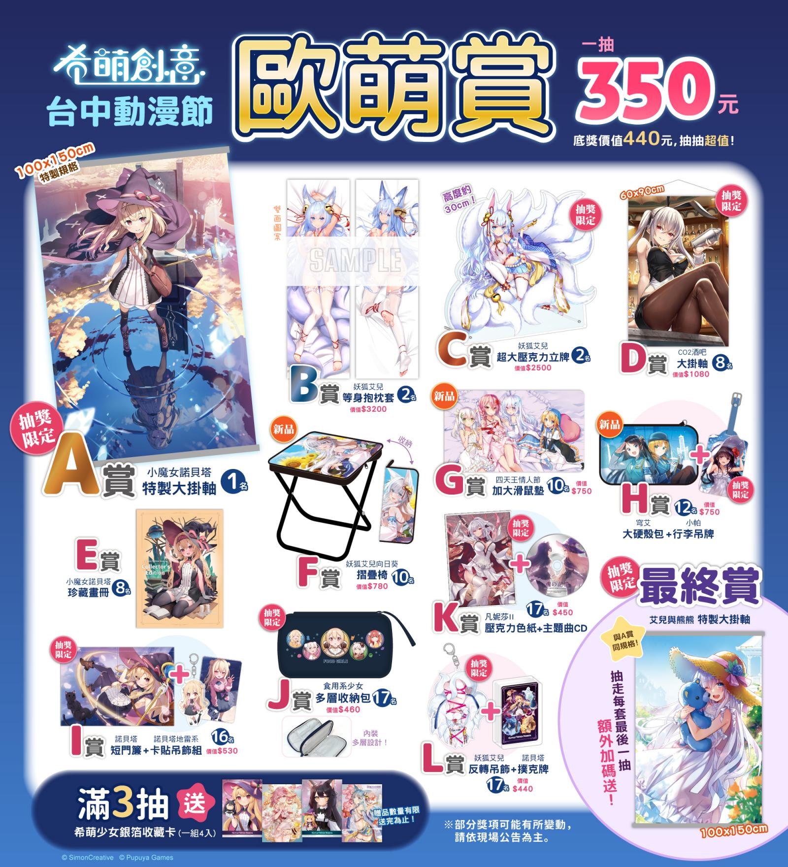 希萌創意《歐萌賞》將在台中動漫節登場!空氣少女艾兒、小魔女諾貝塔、高捷少女等人氣角色都會在歐萌賞裡登場喔!一抽350元,抽抽都超值,底獎價值440元(含)以上。