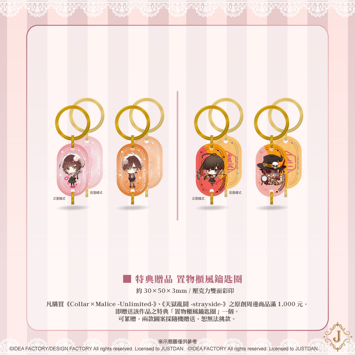 ★ 凡購買《Collar×Malice -Unlimited-》、《天獄亂鬪 -strayside-》之原創周邊商品滿1,000元,即贈送該作品特典「置物櫃風鑰匙圈」一個。特典累積金額依作品分開累計,可累贈,兩款圖案採隨機贈送,恕無法挑款。