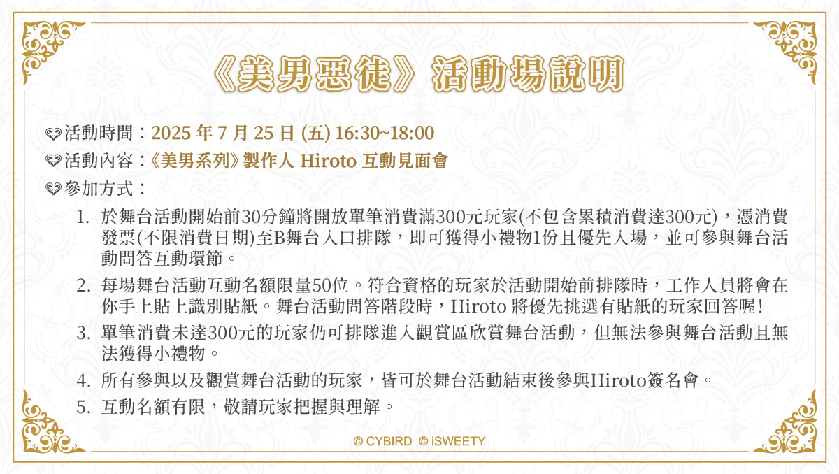本次展出將同步推出全新自製一番賞及多款精美周邊商品,現場開放限量販售。預期在 Hiroto 製作人與《美男惡徒》聯手加持下,將為現場注入滿滿話題與熱度,帶來一場專屬乙女玩家的沉浸式盛宴。