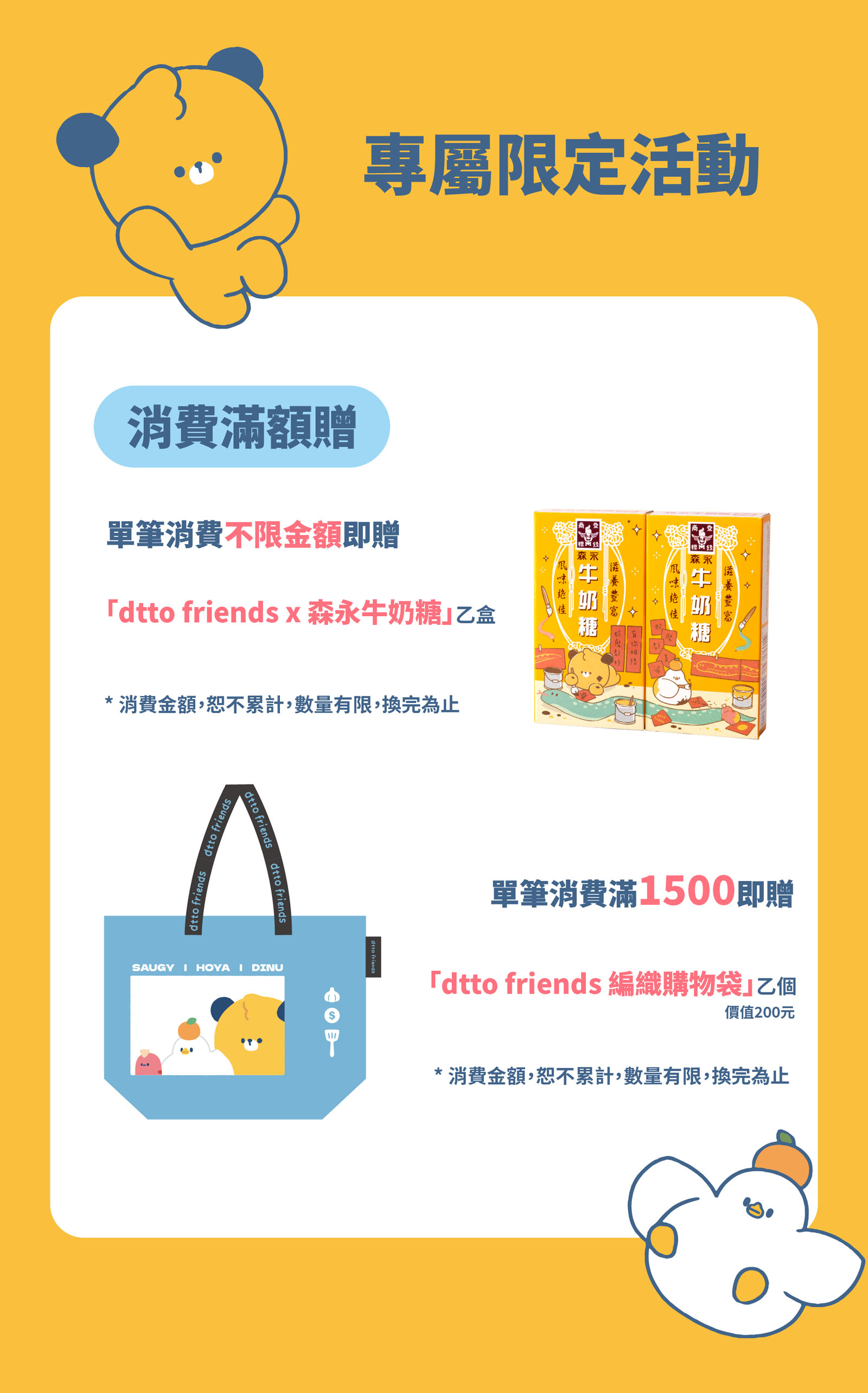 單筆消費不限金額即贈 「dtto friends x 森永牛奶糖」乙盒