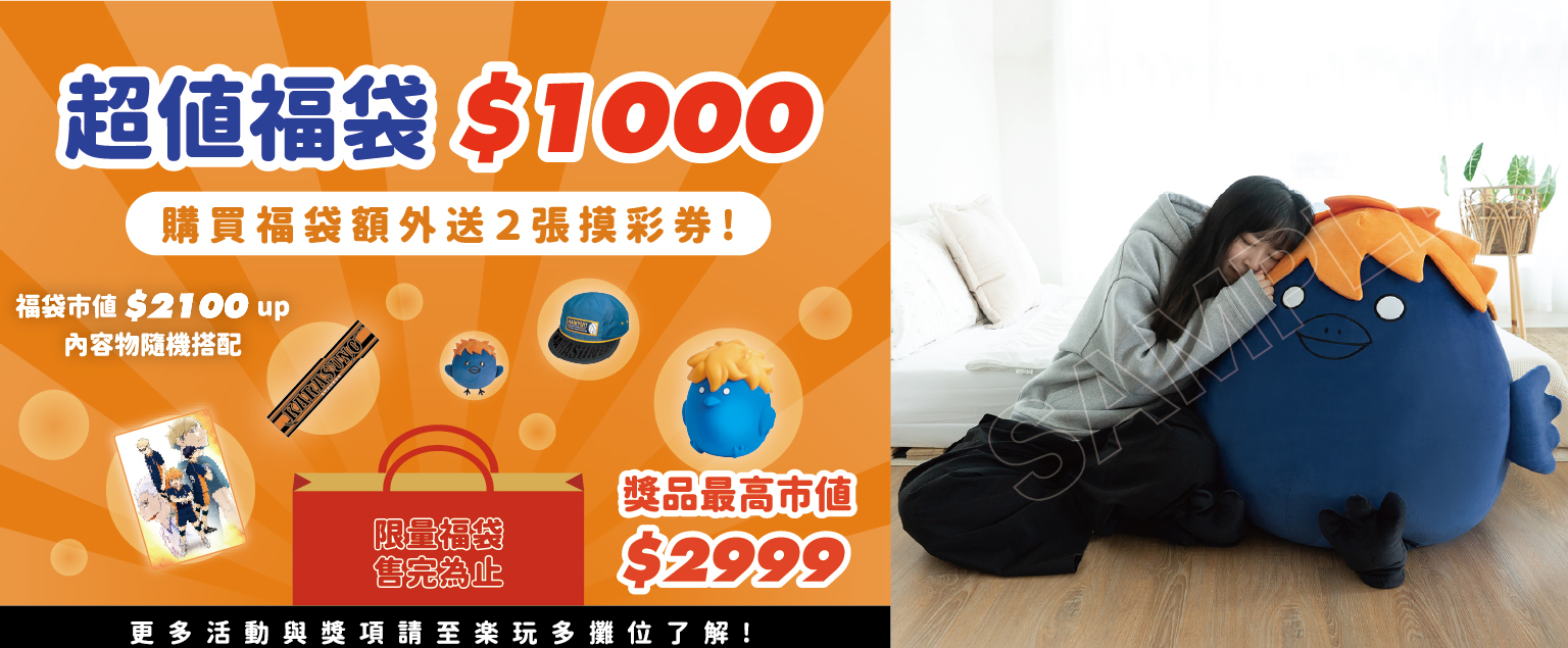此次為漫博特別推出多達八種組合的動漫福袋!$1000元就有機會可以買到容量超大的折疊收納箱、夏天超實用的製冷風扇及運動毛巾等等限量商品,不只超值,也超高CP值,1000元福袋組合市值超過2100元以上!且 前60組只要購買$1000元福袋,就送你驚喜小禮物! 除了$1000元的福袋,還有多款的IP福袋! 可以選擇自己喜歡的角色福袋,用$688元就可以收服各種實用的單品! 有零錢包、大隻玩偶跟超逗趣的造型洗衣袋等等限定周邊。福袋系列都是漫博才有的超殺折扣! 下殺再下殺! 只要購買$1000元的福袋,福袋內就含2張摸彩券、購買$688元的福袋,福袋內就含1張摸彩券! 運氣超讚的朋友將有機會抽中市值超過$2900元的懶骨頭、存錢筒等等好禮。