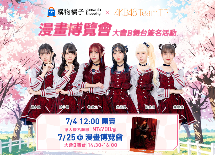AKB48 Team TP 成員將於展會第二日登上大會 B 舞台,舉辦現場簽唱會。為迎接這場面對面互動的盛會,購物橘子將於 7 月 4 日中午 12:00 起,於專屬賣場搶先開賣個人簽名海報,數量有限,售完為止!