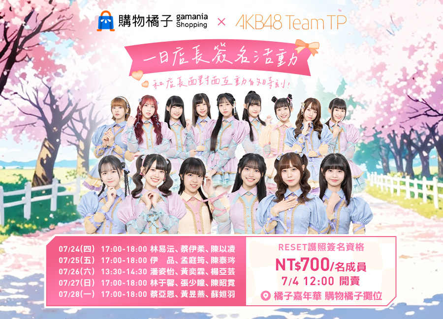 漫畫博覽會期間,AKB48 Team TP 成員將每日擔任一小時的「一日店長」,與粉絲近距離互動!7 月 4 日中午 12:00 起,購物橘子平台將開放販售「RESET 護照簽名資格(不含護照本體)」,數量有限。