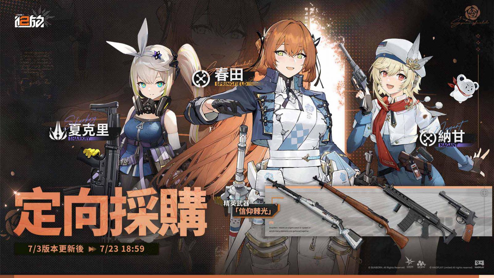 活動期間,在【定向採購】及【軍備提升】中,人形「春田」、「夏克里」、「納甘」及精英武器「信仰棘光」的獲取機率限時提升。