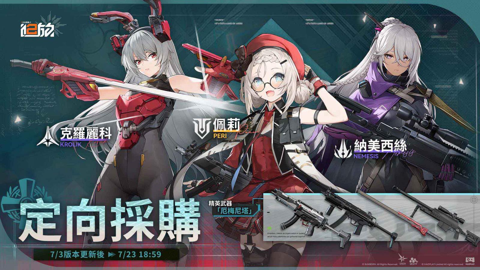 活動期間,在【定向採購】及【軍備提升】中,人形「佩莉」、「克羅麗科」、「納美西絲」及精英武器「厄梅尼塔」的獲取機率限時提升。