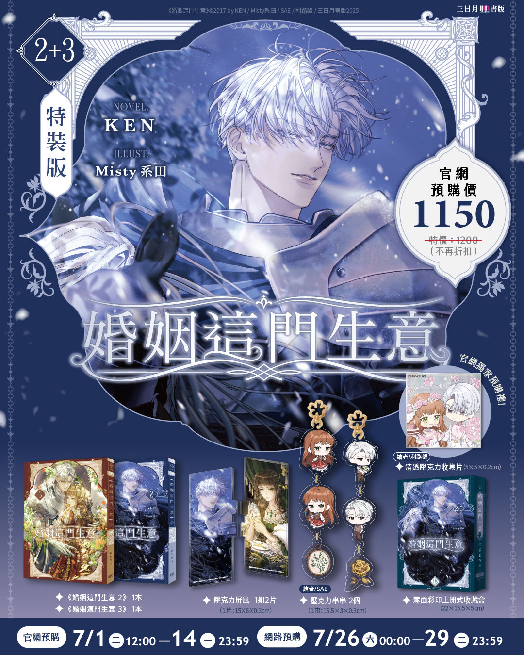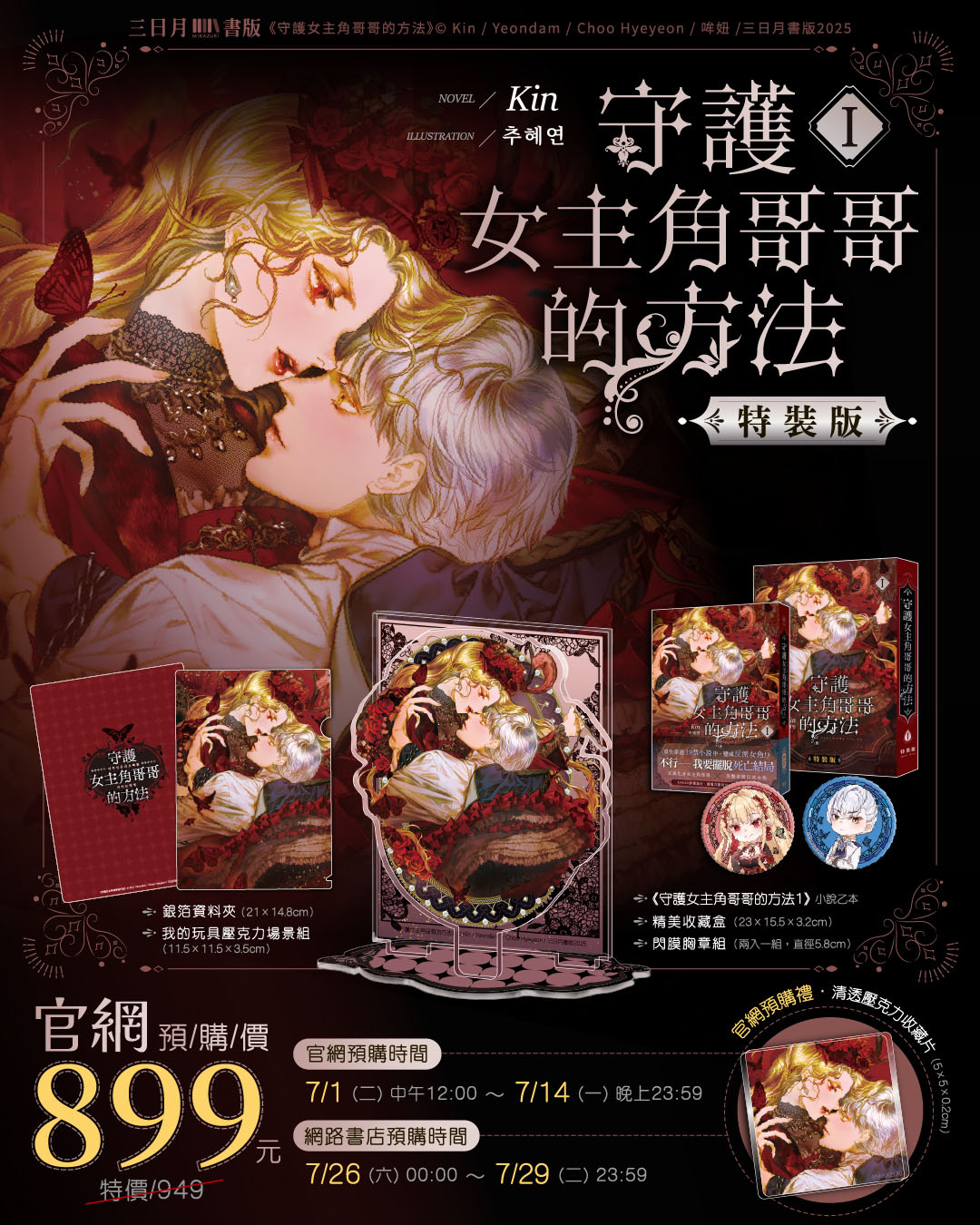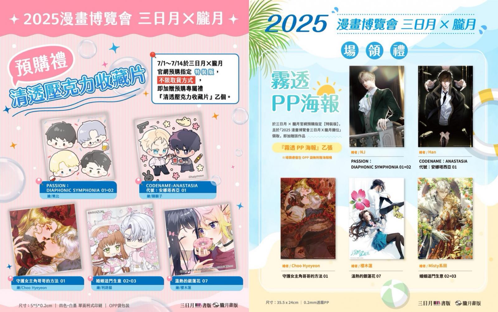 除了現場販售外,在7/1~7/14日預購期間於三日月書版&朧月書版官網預購,購買上述品項,可以享有官網限定50元優惠折扣且另外贈送預購專屬禮「清透壓克力收藏片」乙個!若選擇到2025漫畫博覽會三日月X朧月攤位領取者,還可以額外獲得該部作品的場領特典「霧透PP海報」乙張!