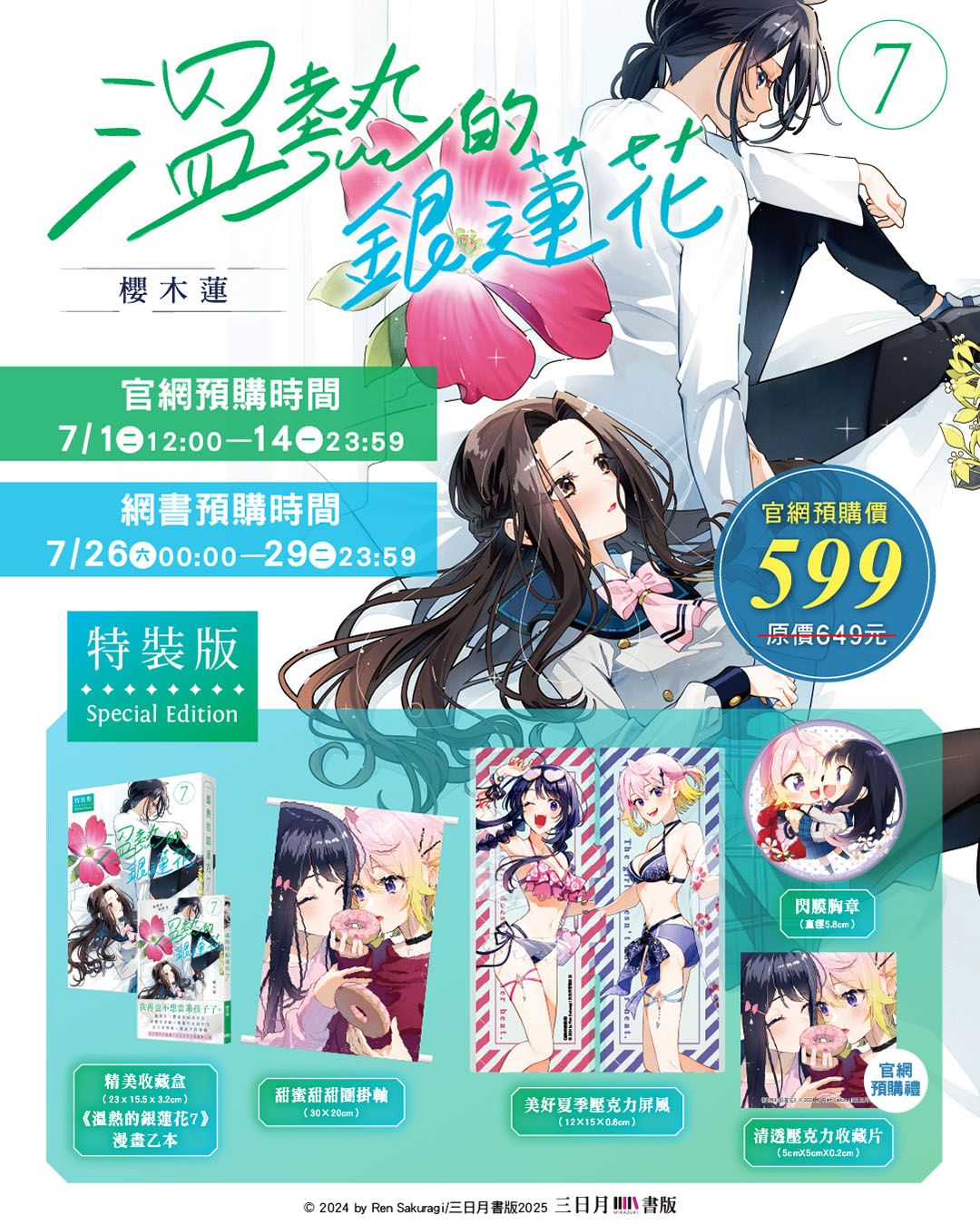 以上是2025漫畫博覽會三日月書版&朧月書版的預購特裝版消息,若想獲得特裝版作品的場領禮即預購禮,請記得於7/1~7/14日至官網預購,並選擇到2025台北國際動漫節現場三日月書版X朧月書版攤位領取喔!