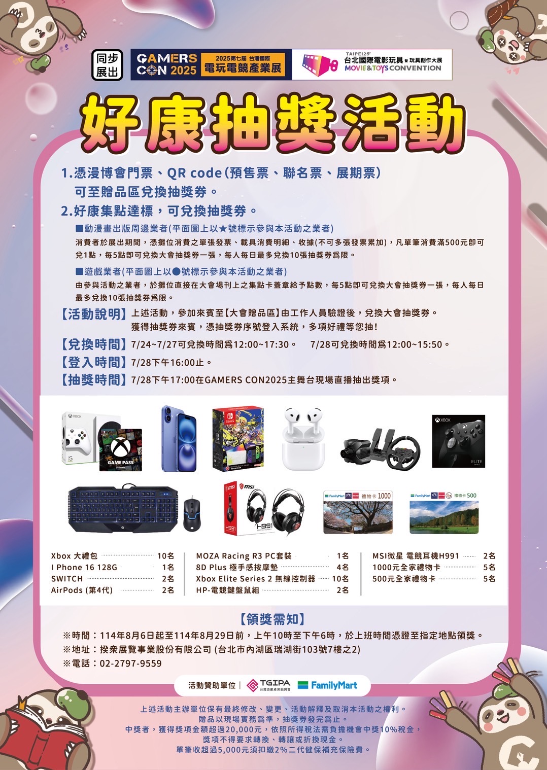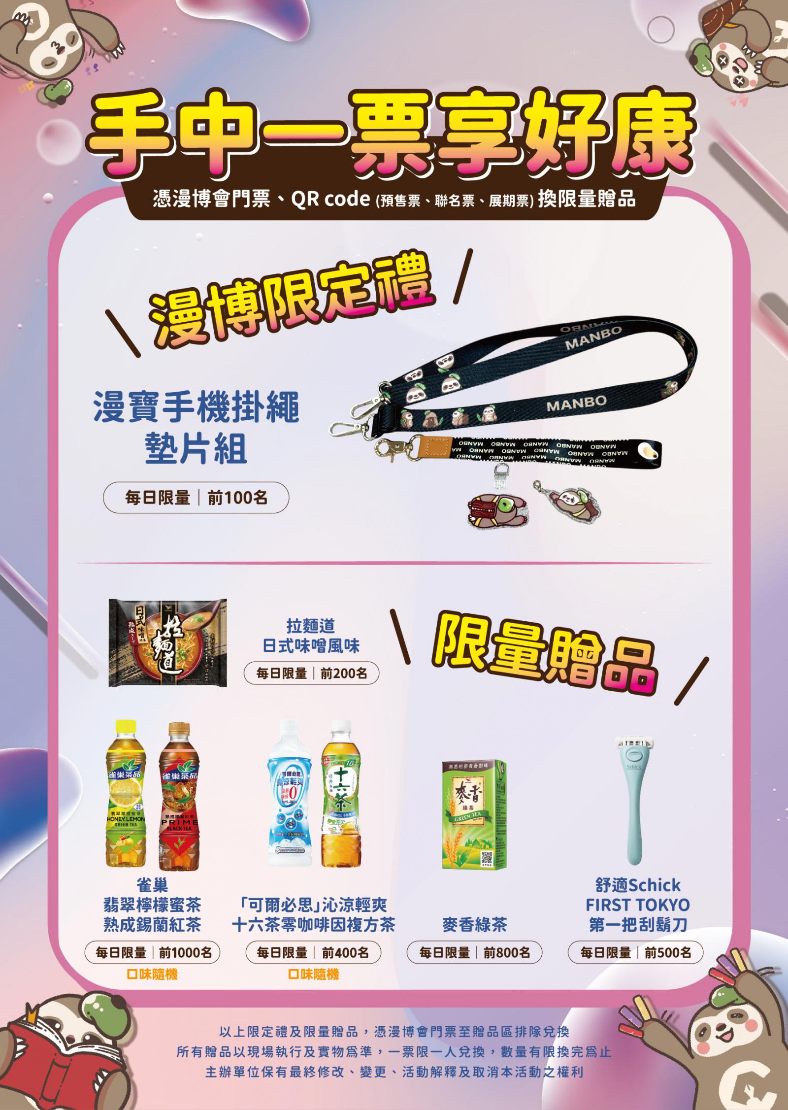 憑漫博會門票、QR code (預售票、聯名票、展期票) 及滿額集點可兌換抽獎券,幸運抽好禮!每日至大會贈品區排隊前100名購票來賓,還可兌換限量漫寶手機掛繩墊片組及限量品!