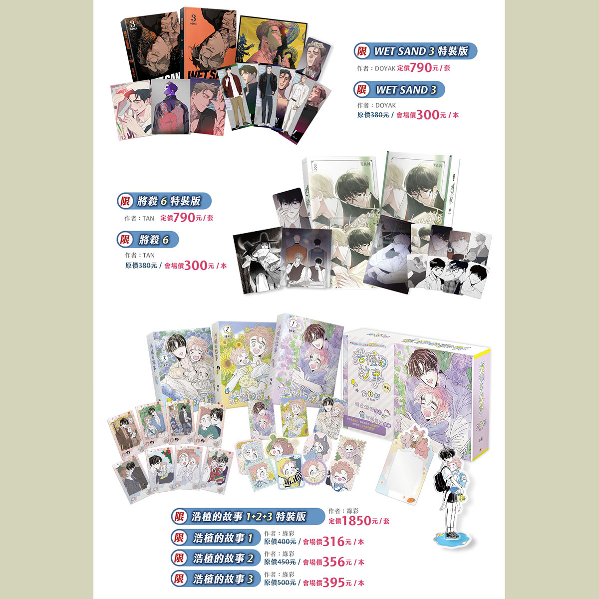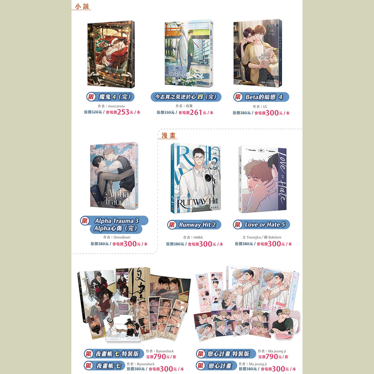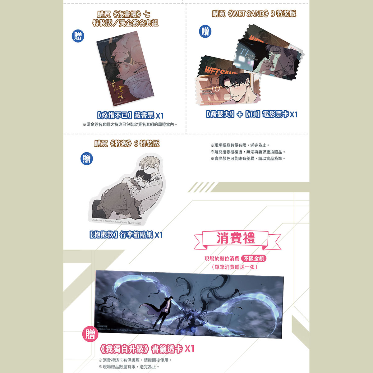 - 現場販售之《夜畫帳》逐光仲夏 燙金簽名套組【數量有限,售完為止】。※現場販售之燙金簽名套組不予累計在滿額贈金額中,亦不包含簽名會抽選資格※
