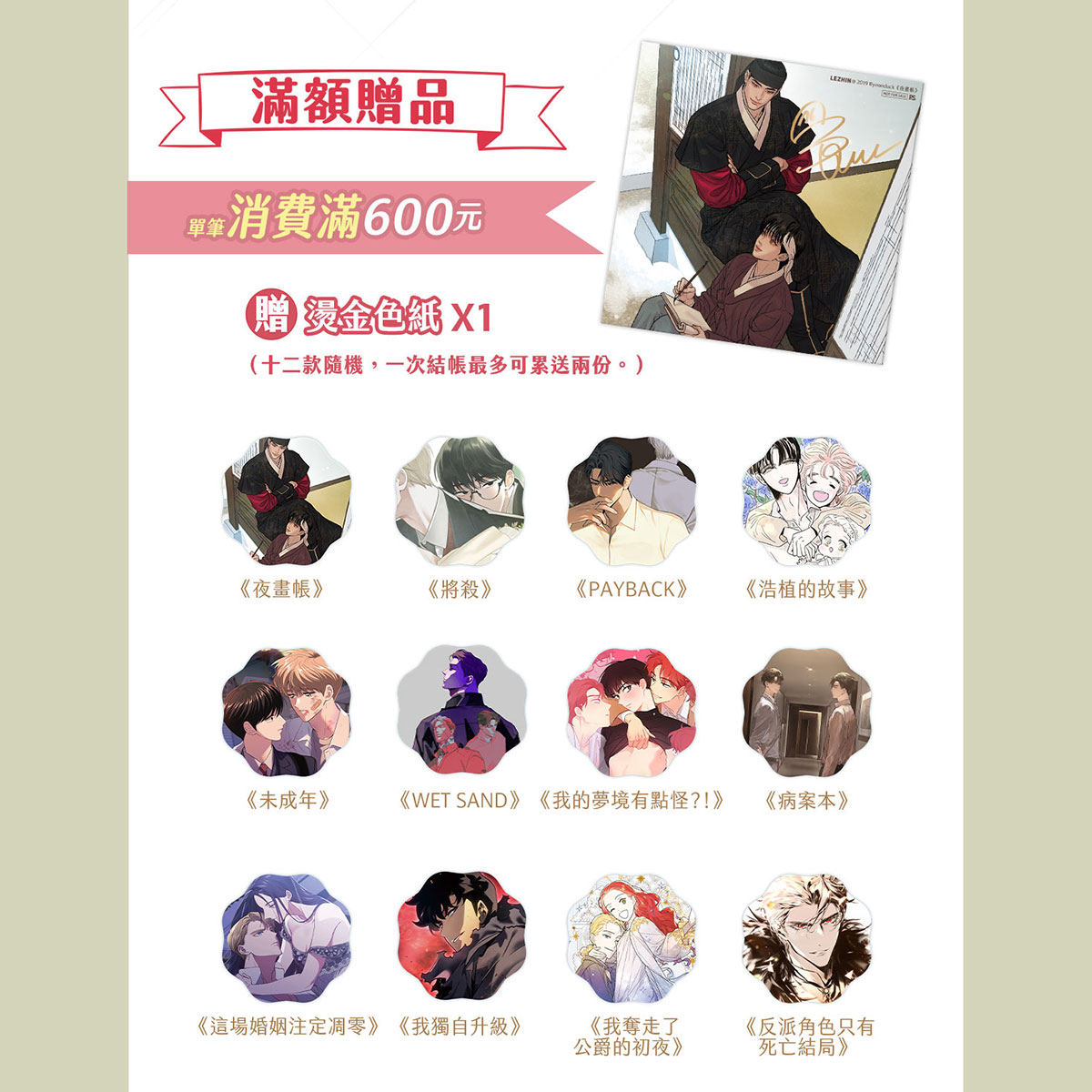 - 滿600元,贈燙金色紙一張(12款隨機,一次結帳最多累送2份)