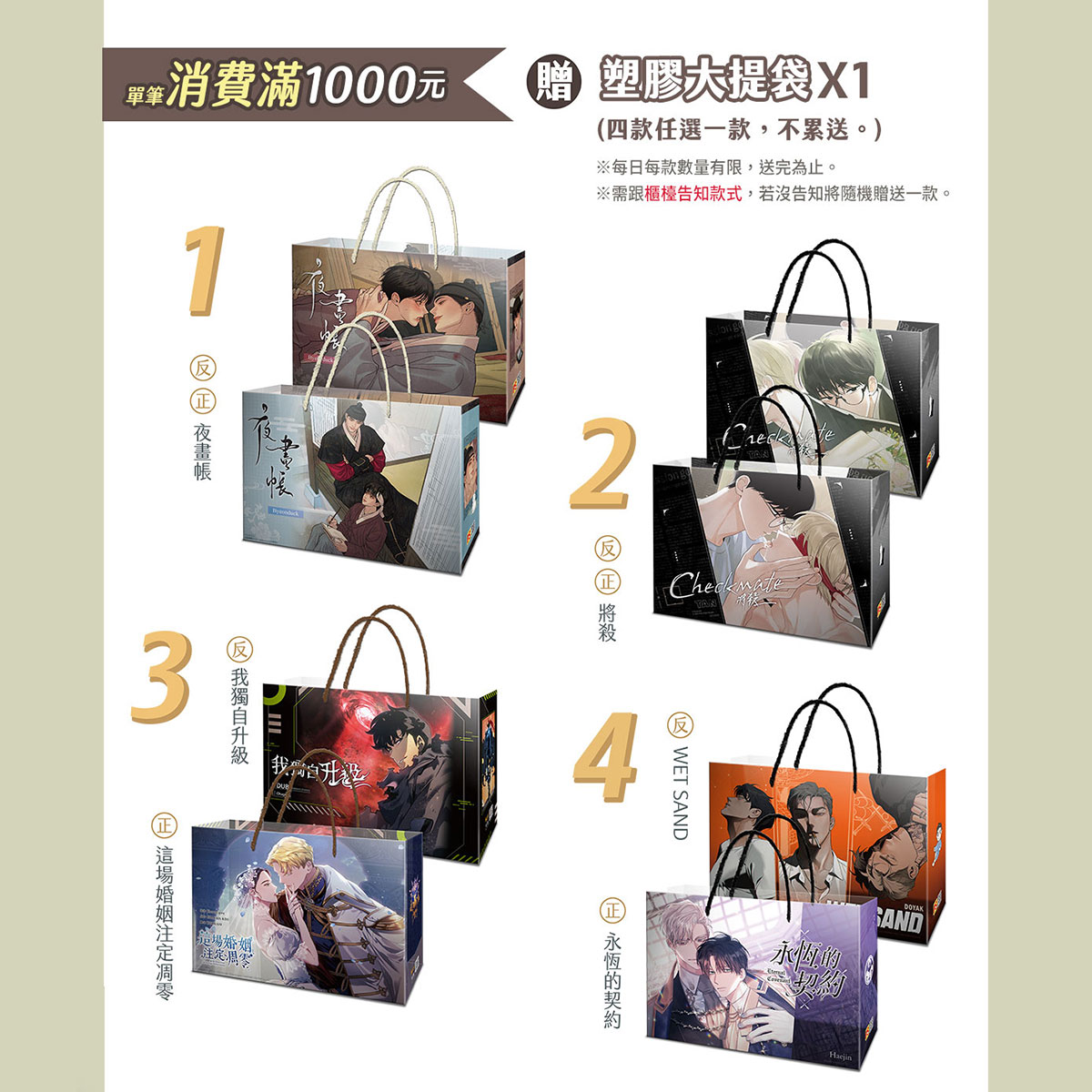 - 滿1000元,贈雙面塑膠大提袋一個(4款任選1款,不累送)