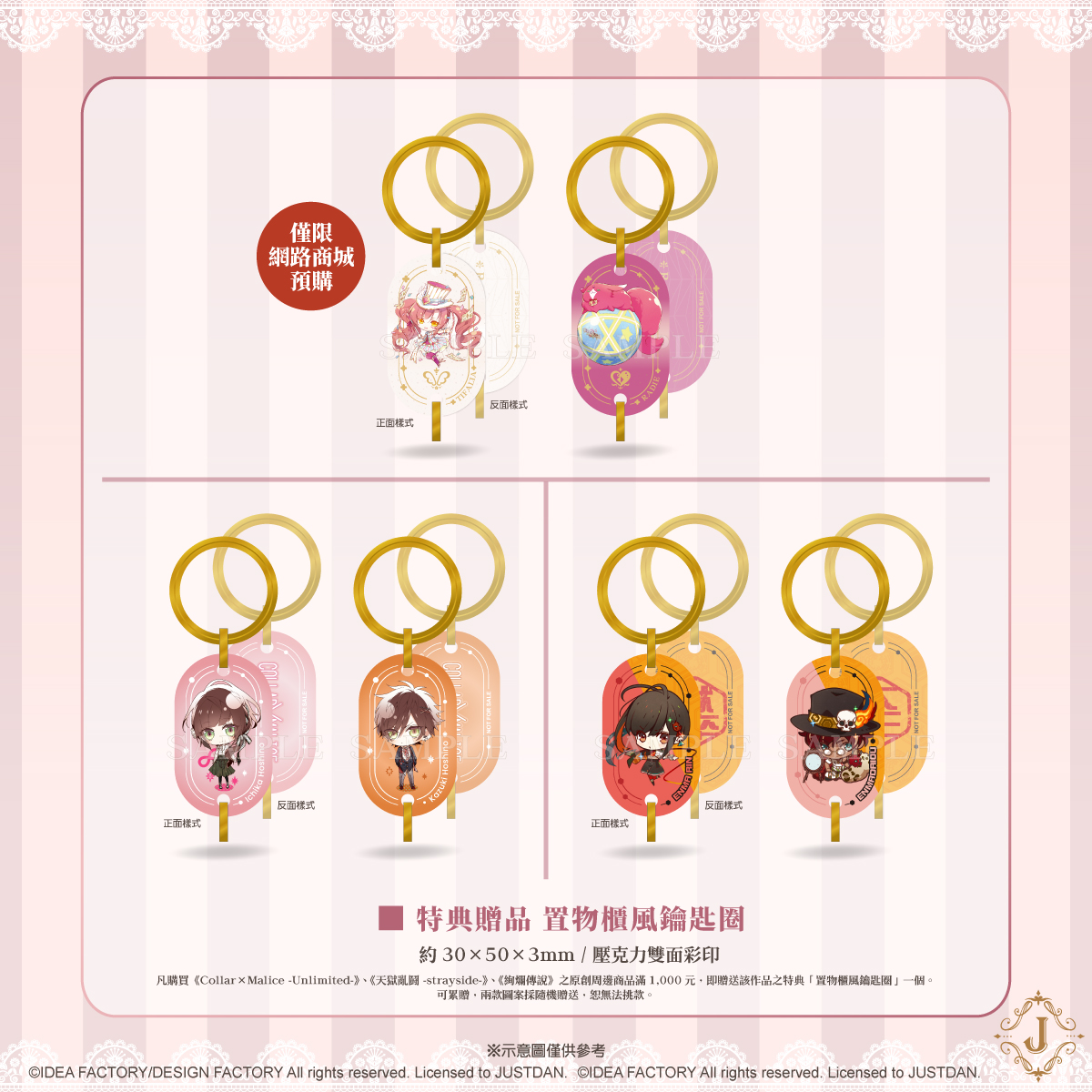 ★凡於漫博會場購買《Collar×Malice -Unlimited-》、《天獄亂鬪 -strayside-》之原創周邊商品滿1,000元,即贈送該作品特典「置物櫃風鑰匙圈」一個。特典累積金額依作品分開累計,可累贈,兩款圖案採隨機贈送,恕無法挑款。