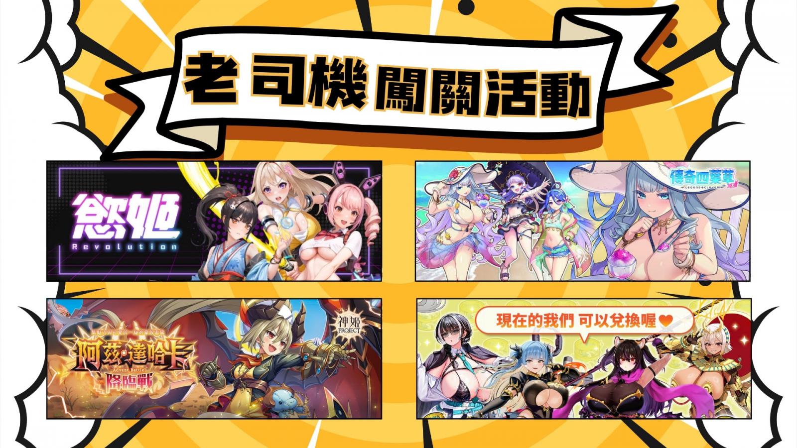 除原創國產新作,《BanaBana》亦展出三款聯運遊戲《神姬計劃X》、《傳奇四葉草X》與《Last Origin:最後的起源》,現場設有試玩機台與PV播放牆,邀請玩家親身體驗多元遊戲魅力。同時推出專屬闖關活動,只要完成指定任務即可參與抽獎,包含完成《慾姬Revolution》事前預約、註冊BanaBana會員帳號,以及現場瀏覽指定漫畫頁面,集滿三項任務即獲抽獎資格。
