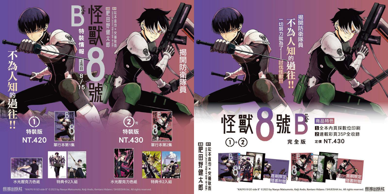 首發推出人氣連載作品,出自松本直也老師擔綱原作、安藤敬而老師改編的《怪獸8號》外傳小說,由肥田野健太郎老師改編漫畫《怪獸8號 side B》,為你揭開隊員們不為人知的過往!特裝版收入單行本、水光壓克力色紙、特典卡2入組,1、2集分開販售。除此之外,本次更推出將連載彩頁全收錄的《怪獸8號 side B(1)+(2)》完全版,於會場獨家限量販售!
