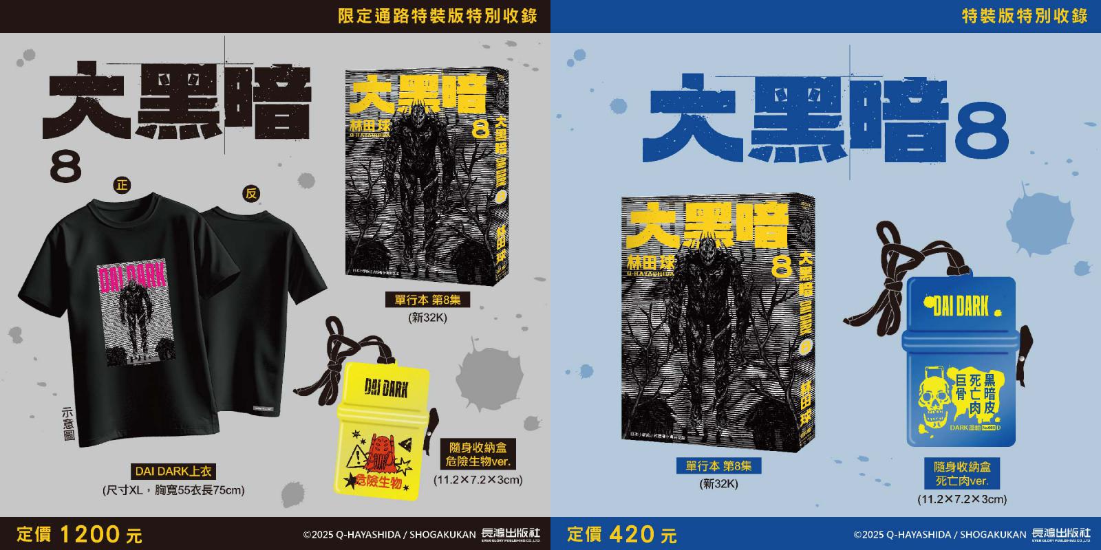 宇宙科幻×黑色幽默,林田球《大黑暗(8)》原本該是宇宙船的地方出現了一座可疑城堡,達美丸宇宙船的星球究竟發生了甚麼事!?另推出限定通路特裝版及一般特裝版,限定通路特裝版內含單行本第8集、DAI DARK上衣、隨身收納盒(危險生物ver.),一般特裝版內含單行本第8集、隨身收納盒(死亡肉ver.)。
