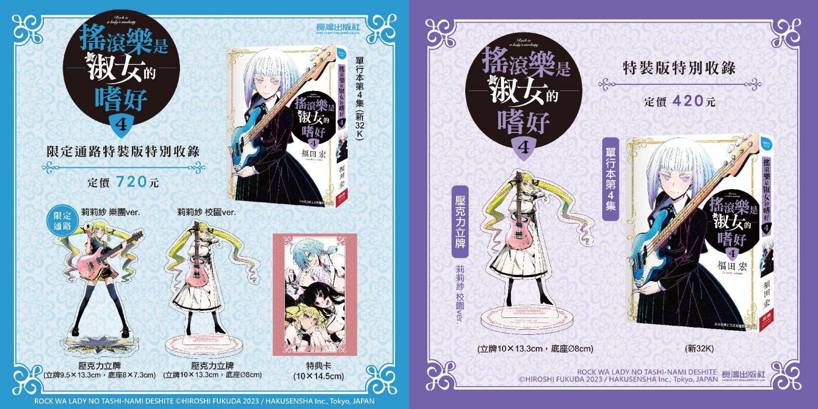 福田宏《搖滾樂是淑女的嗜好(4)》千金小姐×青春×樂團,華麗端莊少女們的音樂青春譚,本次推出限定通路特裝版及一般特裝版,限定通路特裝版內含單行本第4集、莉莉莎壓克力立牌(校園ver.&樂團ver.)及特典卡,一般特裝版內含單行本第4集、莉莉莎壓克力立牌(校園ver.)。