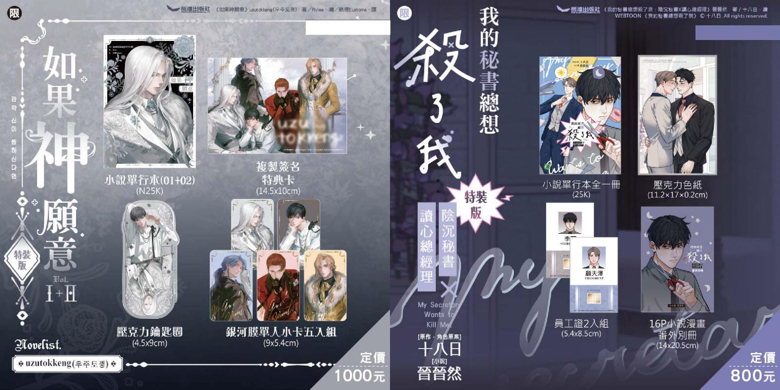 LINE WEBTOON高人氣職場修羅愛情喜劇BL作品小說化,劇本原作漫畫家十八日老師×台耽原創作者晉晉然《我的秘書總想殺了我:陰沉秘書×讀心總經理》,陰沉反社會系秘書×擁有讀心雷達總經理,一場因誤會萌生的雙向單戀!親簽特裝版收錄單行本、壓克力色紙(十八日+晉晉然作者親簽)、員工證2入組、16P小說漫畫番外別冊、感溫明信片。
