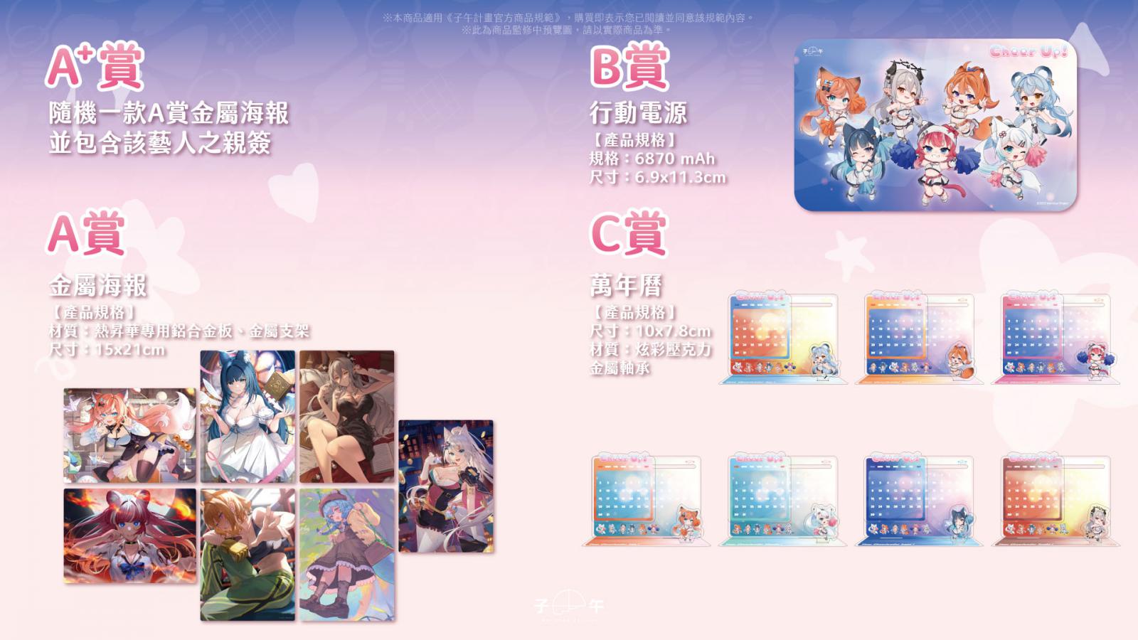 女子組A賞為金屬海報。另有各式豐富獎項,包含 行動電源、萬年曆、厚海報、小吊飾與胸章、發光鍵冒吊飾、明信片組…等,更有最後賞等待大家來挑戰。此次也特別推出現場限定滿額禮,只要在現場消費滿 2000元即可獲得紙袋一份。