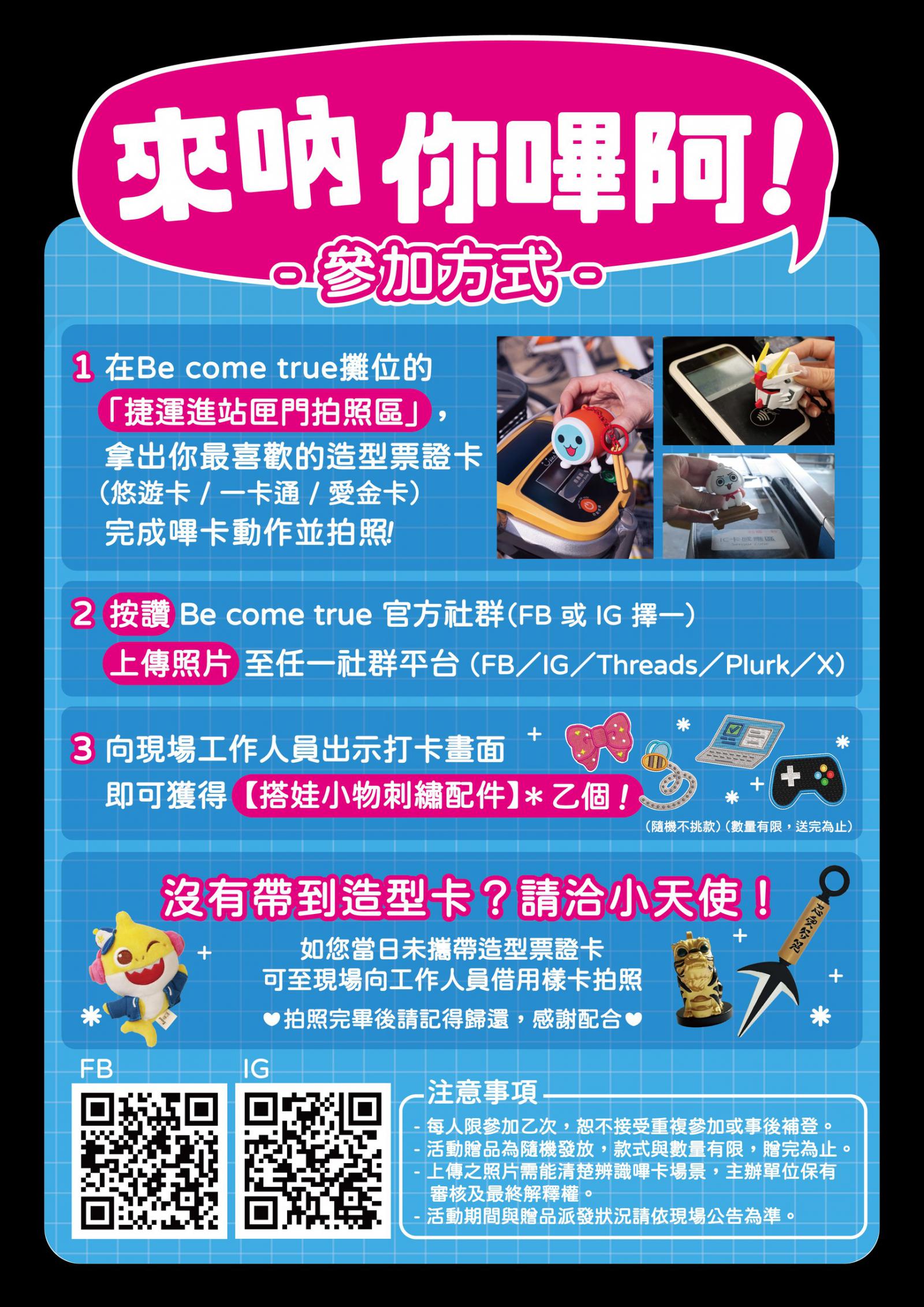 於 Be come true 攤位與造型票證卡在「捷運進站匣門拍照區」合照,完成上傳即有機會獲得搭娃小物配件乙個。