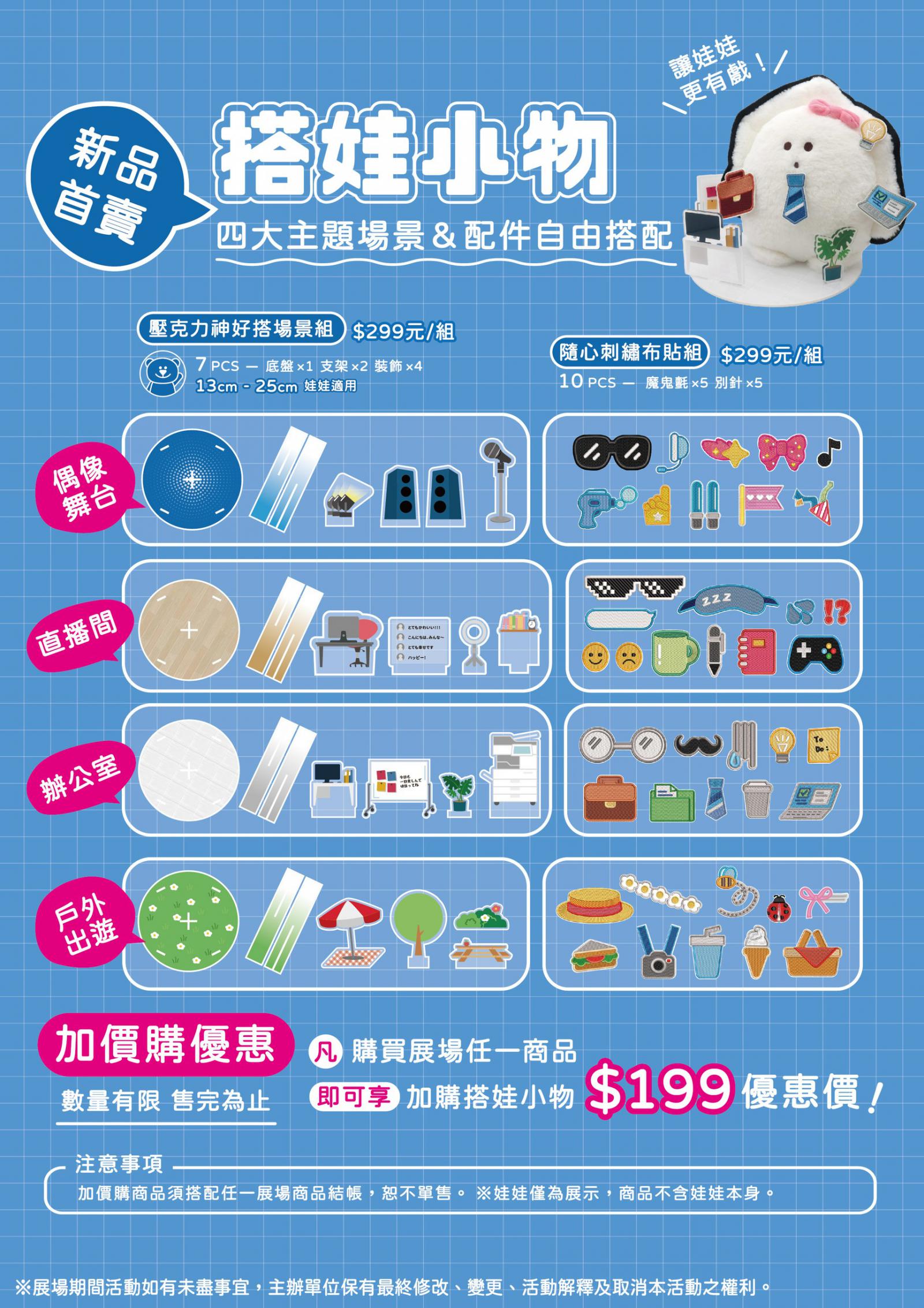 展場首賣「壓克力場景、刺繡布貼」玩偶搭配套件,打造娃娃專屬展示區。
