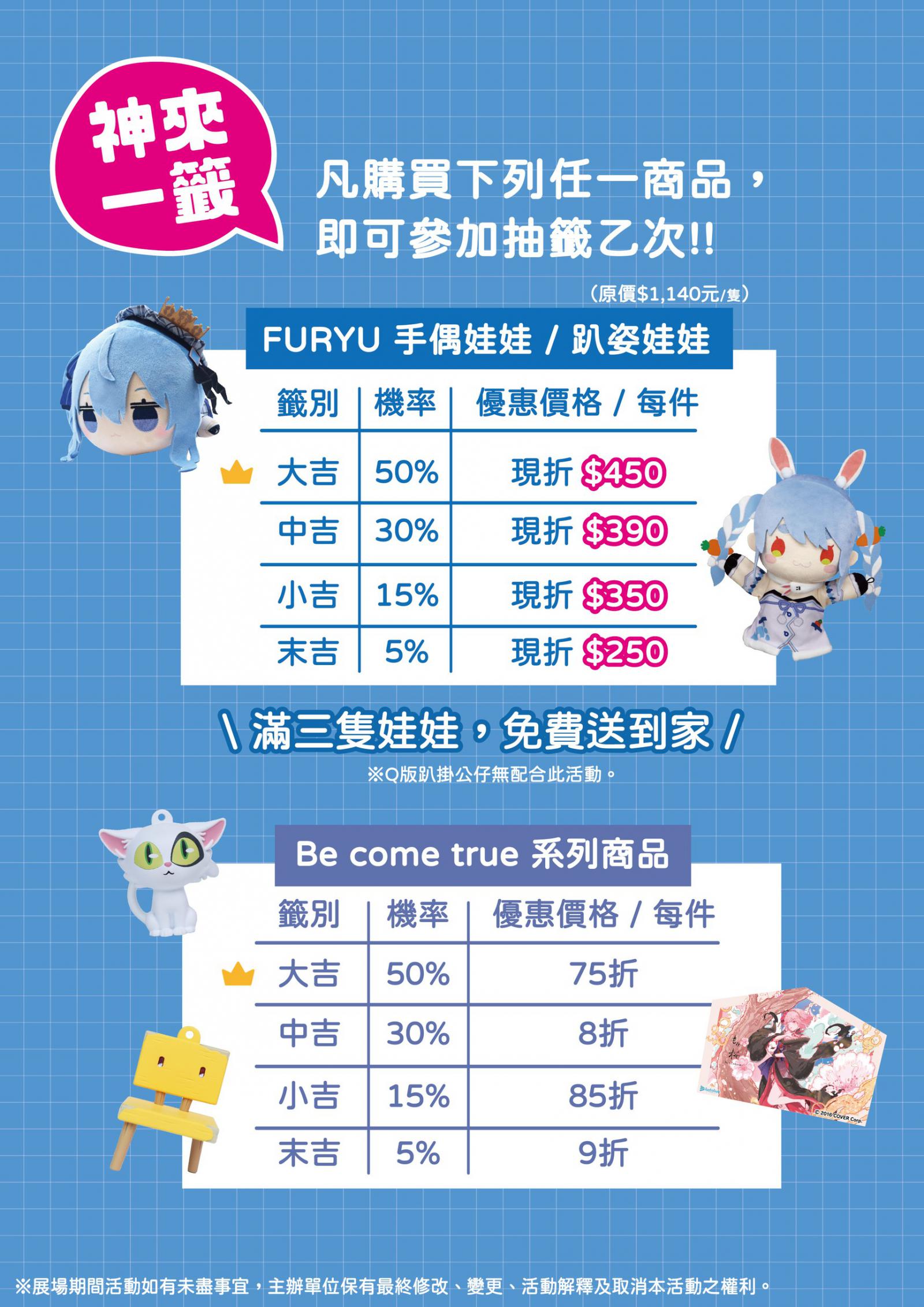 除了強檔新品預告外,攤位入口處打造模擬捷運票卡感應匣門區,「來吶,你嗶啊!」向大眾發出邀請,「炫」出自己的造型票證卡,完成任務就可免費獲得精美搭娃小配件,搭配現場販售的絨毛娃娃,以及首次販售的話題新品「壓克力神好搭場景組」與「隨心刺繡布貼組」,充滿療癒感的配件組為心愛的娃自由搭配不同情境更加有趣!此外,hololive / 趴趴小夥伴 Q版趴掛公仔也首度在現場實體展售,歡迎喜愛Vtuber的粉絲們到現場參觀選購!