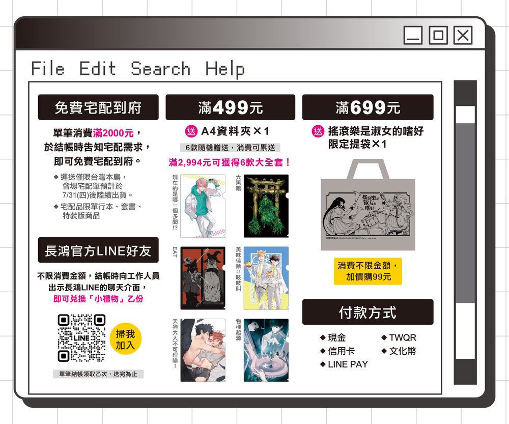 消費滿699元,即送「《搖滾樂是淑女的嗜好》限定提袋」乙個,若消費未達699元也可加價99元購買,此贈品單筆消費不可累積贈送,單筆消費發票限加購一次。消費超過2,000元可再享宅配到家服務(僅限台灣本島,宅配商品僅限特裝版、單行本及套書),讓您解放雙手保存體力,輕鬆逛展!