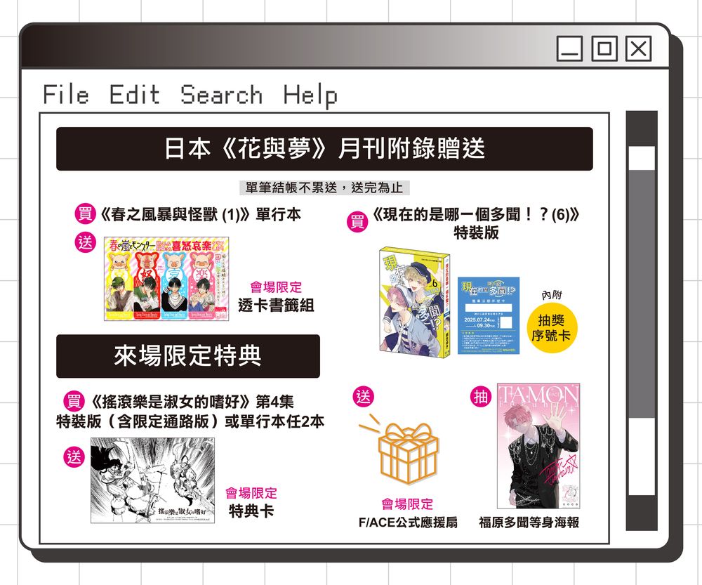 長鴻加碼推出漫博會會場限定特典活動——現場購買《現在的是哪一個多聞!?(6)》特裝版乙件,即可獲得限量「F/ACE公式應援扇」乙個。憑特裝版中所附的抽獎序號卡,還可再抽「福原多聞等身海報」乙張,抽獎詳情還請見長鴻網頁喔!