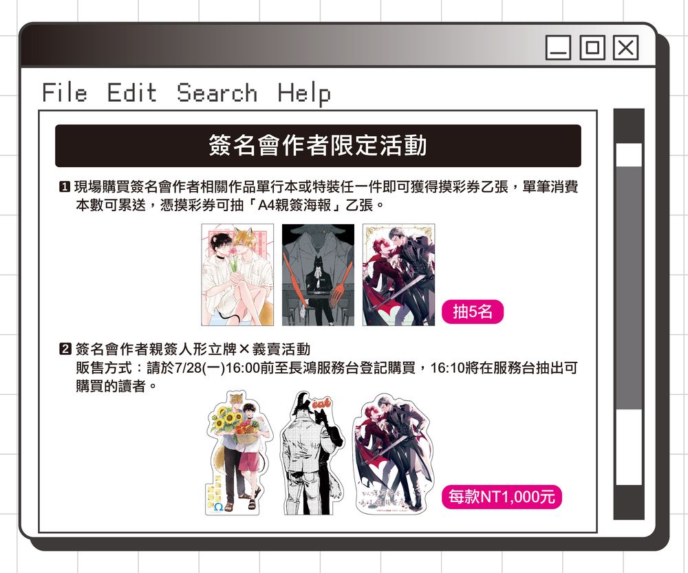 除了親簽海報的摸彩,活動期間更將加碼進行人形立牌義賣活動,屆時會在現場開放登記並抽出購買資格。此次義賣所得收入將全數捐出,活動捐款證明及捐贈單位會在活動結束後於長鴻出版社粉絲專頁公布,在此誠摯邀請各位讀者多多支持,愛漫畫做愛心!