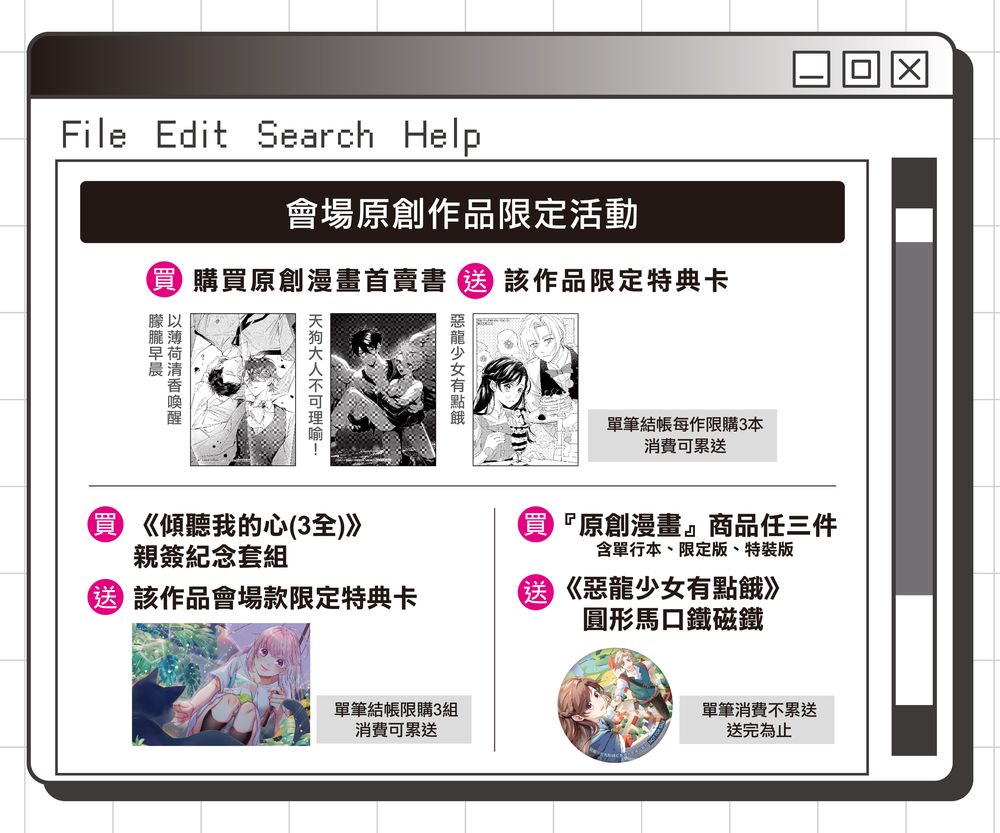 本次漫博會也有原創作品限定活動!於長鴻攤位購買任一國人原創首賣書,就可獲得該作品限定「特典卡」乙張。購買原創漫畫商品任三件(含單行本、限定版、特裝版),即可獲得超可愛的「《惡龍少女有點餓》限量圓形馬口鐵磁鐵」乙個。