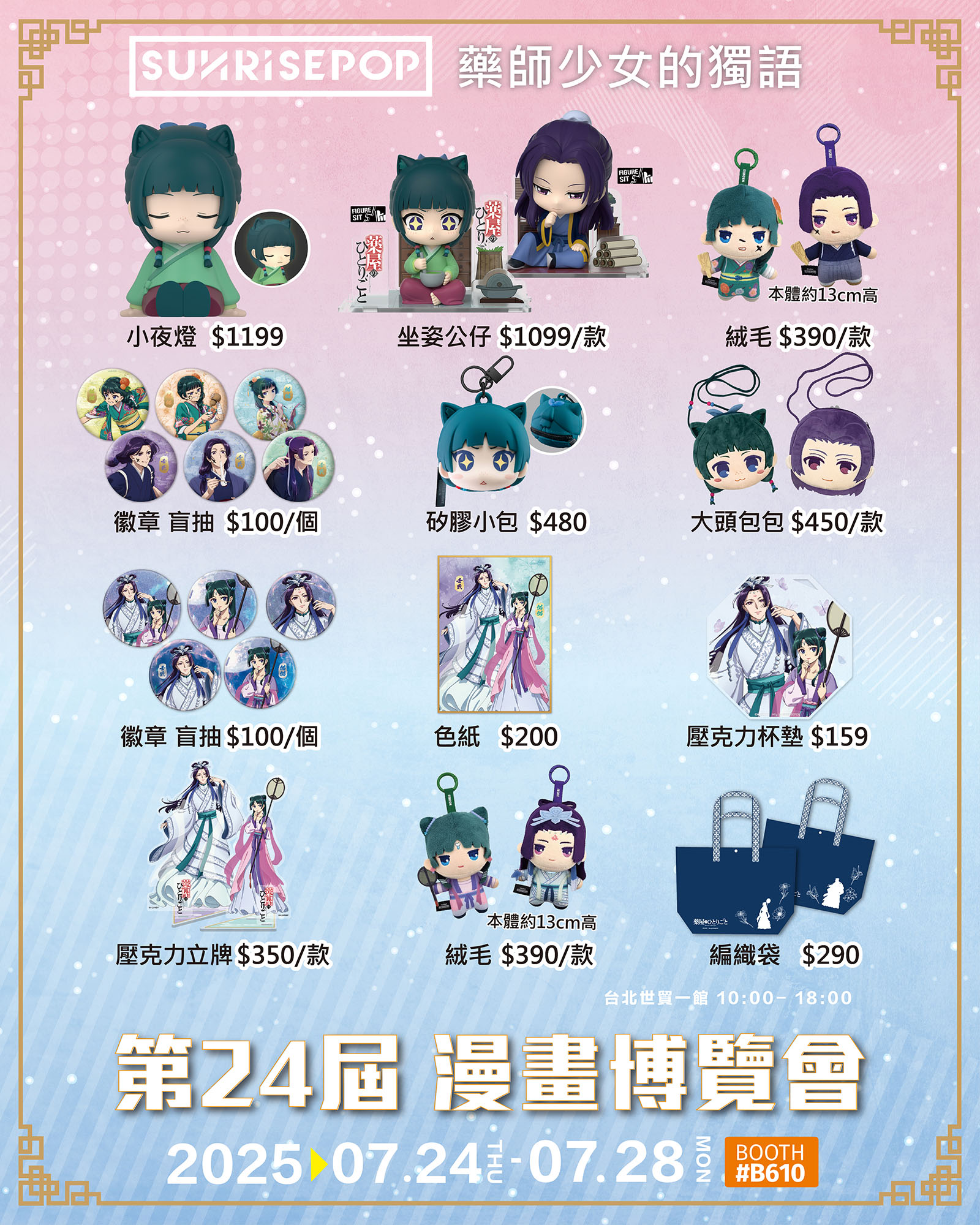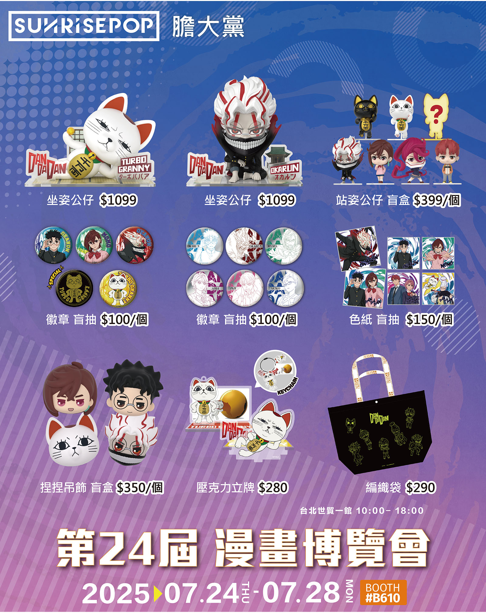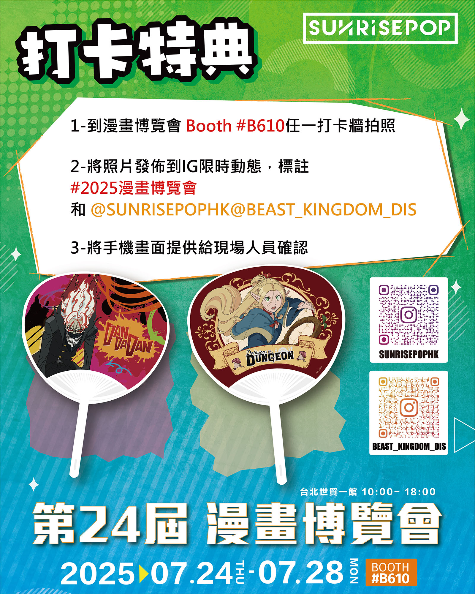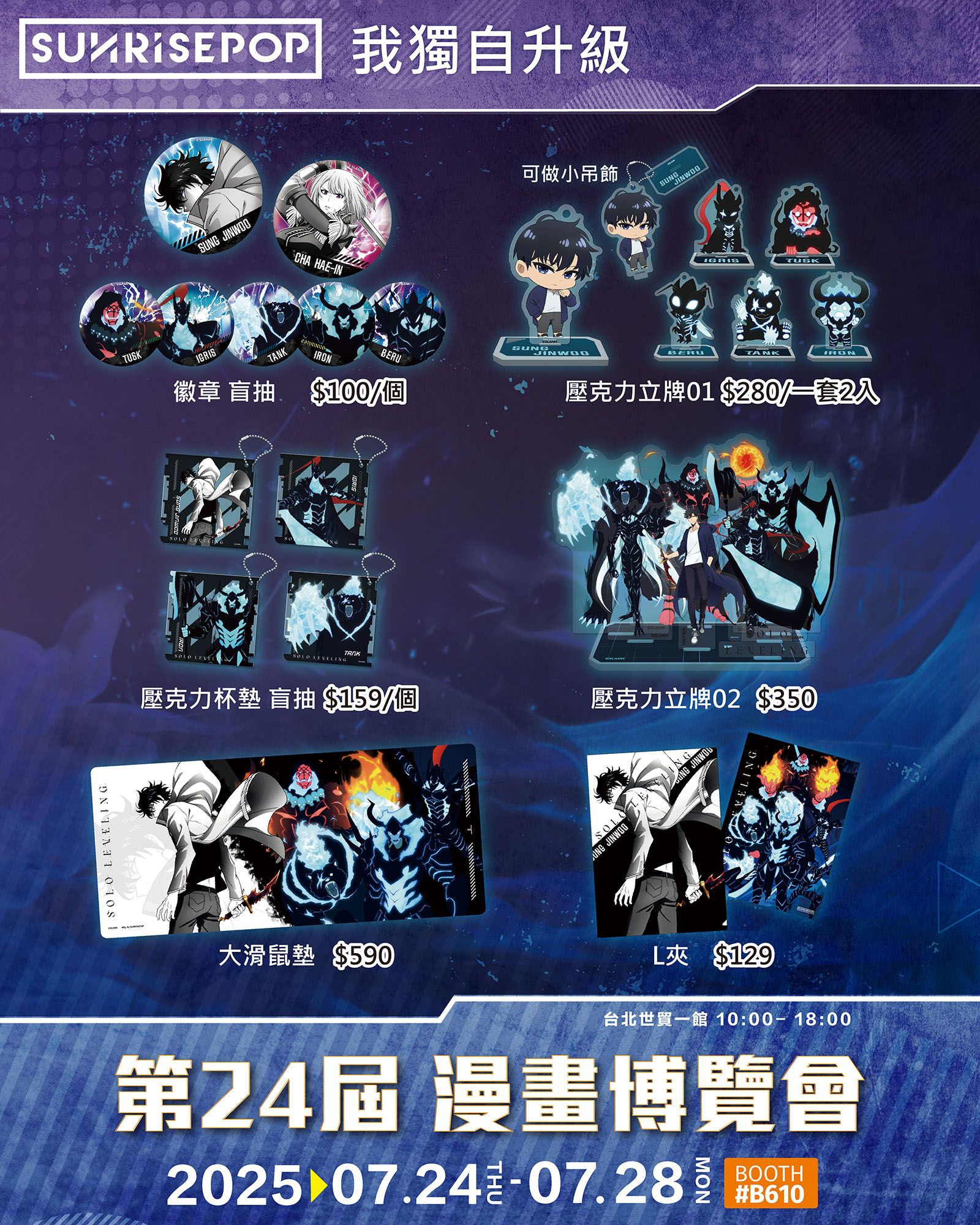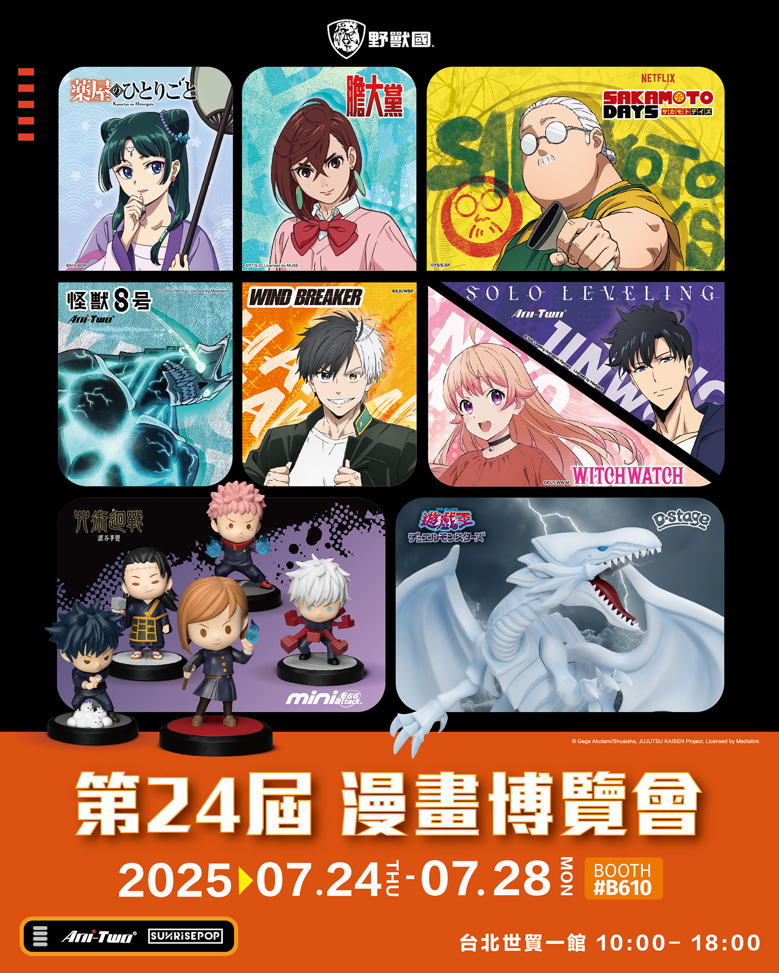 台灣知名娛樂體驗創造品牌「野獸國」攜手香港品牌「SUNRISEPOP」參加2025漫博會,為各位粉絲帶來知名動畫《我獨自升級》、《魔女守護者》、《膽大黨》、《坂本日常》、《藥師少女的獨語》、《怪獸8號》和《防風少年》的最新展品及相關周邊商品!