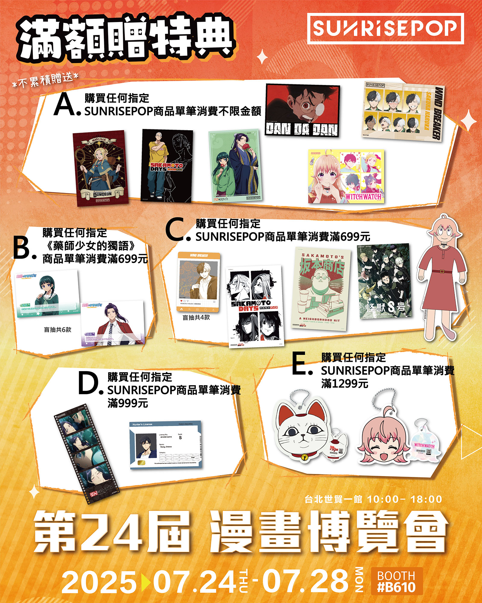 野獸國 x SUNRISEPOP 2025漫博會《我獨自升級》、《魔女守護者》、《膽大黨》、《坂本日常》、《藥師少女的獨語》、《怪獸8號》和《防風少年》商品情報釋出