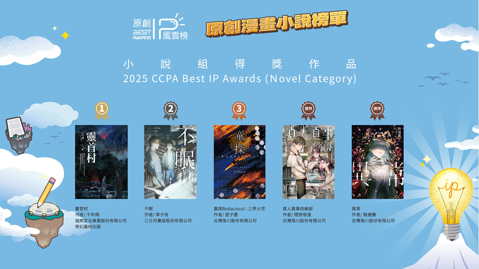 此外,由台灣角川股份有限公司出版的《真人真事改編部(作者:理想很遠)》、《異常(作者:路邊攤)》同樣表現亮眼,共同入選本屆小說組TOP IP獎佳作。