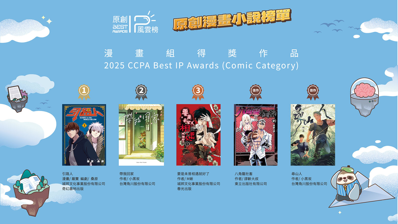 而東立出版社有限公司的熱血格鬥作品《八角籠社畜(作者:謬齡大叔)》、台灣角川股份有限公司《尋山人(作者:艸肅Tsaosu)》兩部作品同獲評審肯定名列本年度漫畫TOP IP獎佳作。