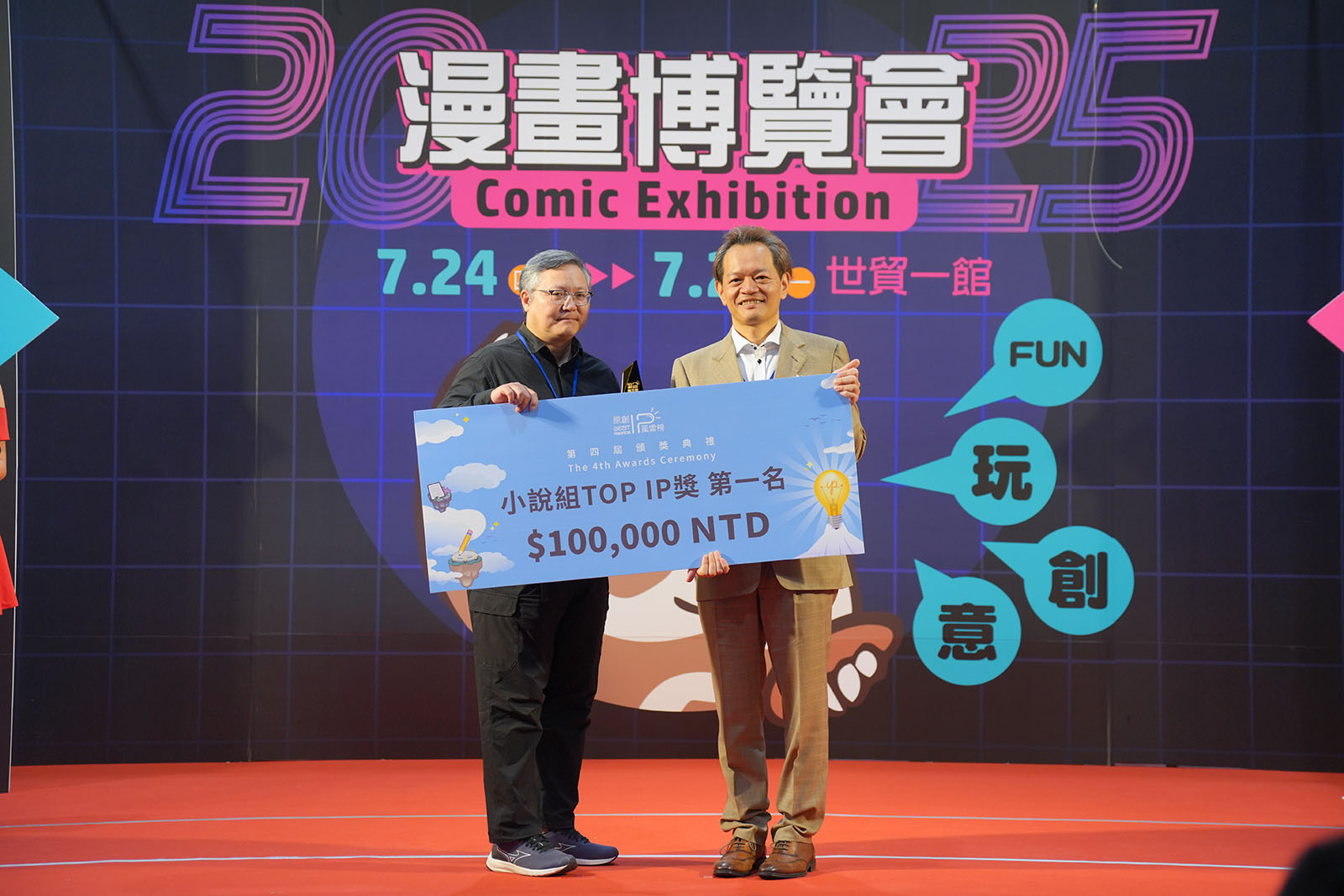 ▲ 頒發小說組TOP IP獎佳作(作品《異常》作者路邊攤老師/踢帕娛樂股份有限公司 詹仁雄董事長)