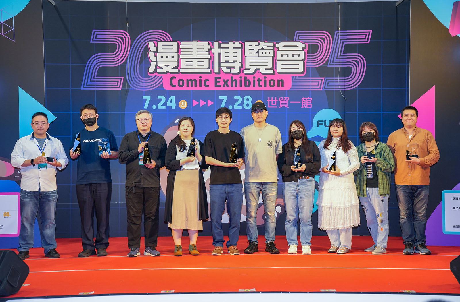 ▲ 獲獎嘉賓由左至右分別為:《異常》作者路邊攤老師、台灣角川股份有限公司喬齊安編輯、城邦文化事業股份有限公司奇幻基地出版張世國編輯、《不眠》作者草子信老師、《引路人》漫畫家羅寶老師、《引路人》編劇桑原老師、台灣角川股份有限公司林修貝編輯、《要是未曾相遇就好了》作者M蜥老師、台灣角川股份有限公司陳育婷編輯、東立出版社有限公司梁守維編輯