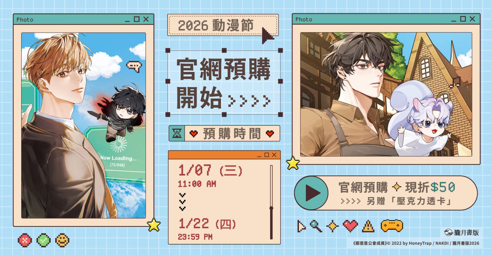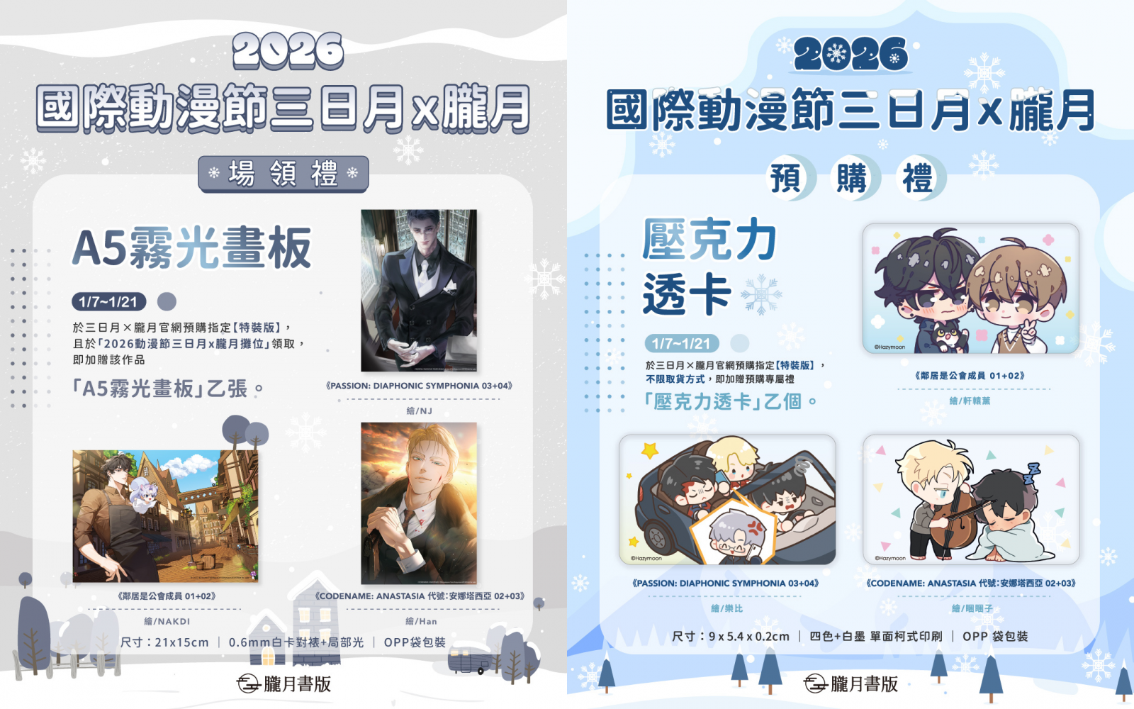即日起至1/22的預購期間,於三日月書版&朧月書版官網完成預購,並選擇於動漫節現場領取的讀者,不僅可以獲得該作品的場領特典「A5霧光畫板」乙張!還可享有預購專屬禮「壓克力透卡」乙個,以及官網限定折50元的預購價!