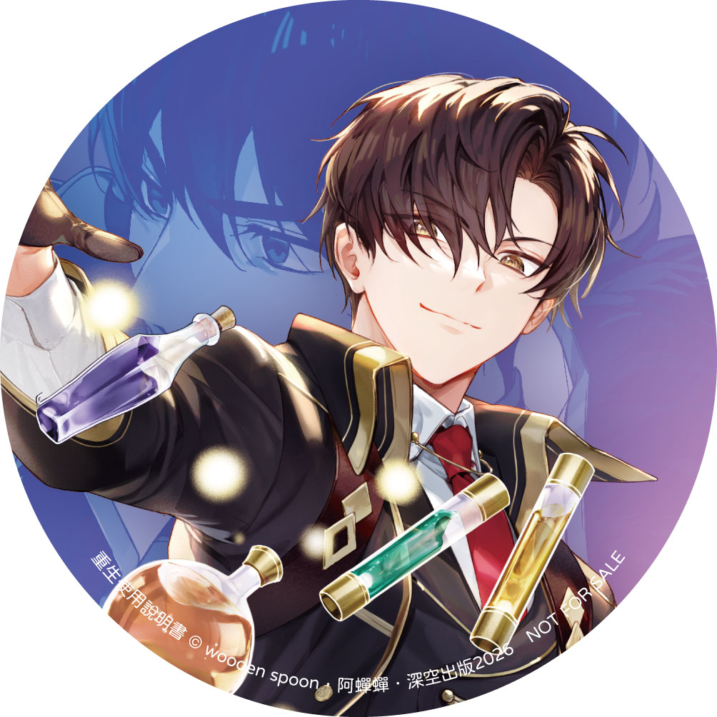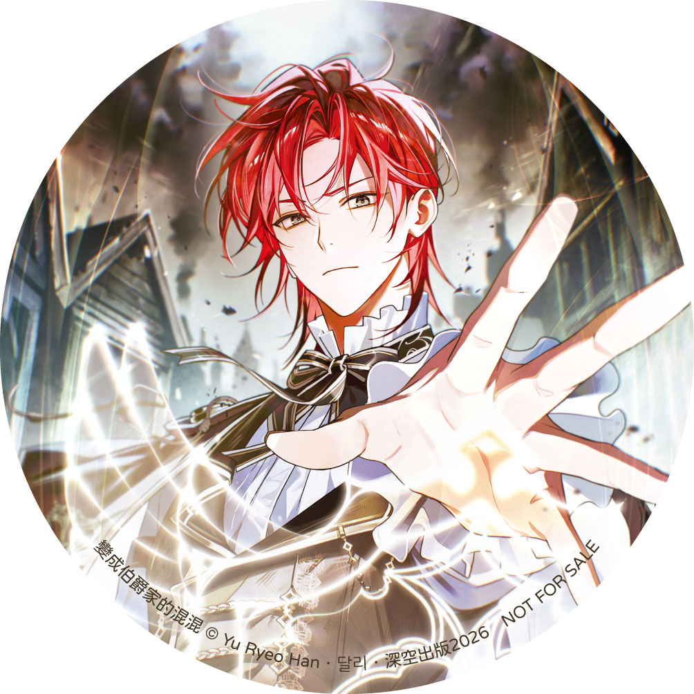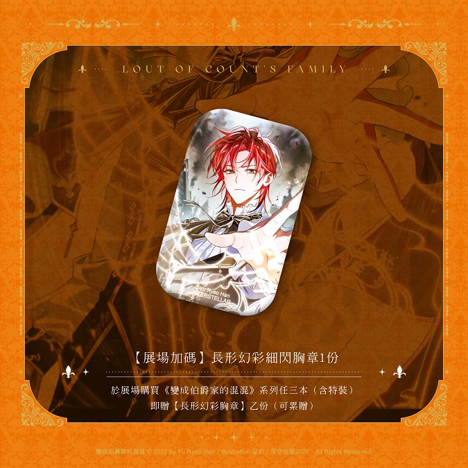 於展場購買《變成伯爵家的混混》系列任三本(含特裝),即贈【長形幻彩胸章】乙份(可累贈)。