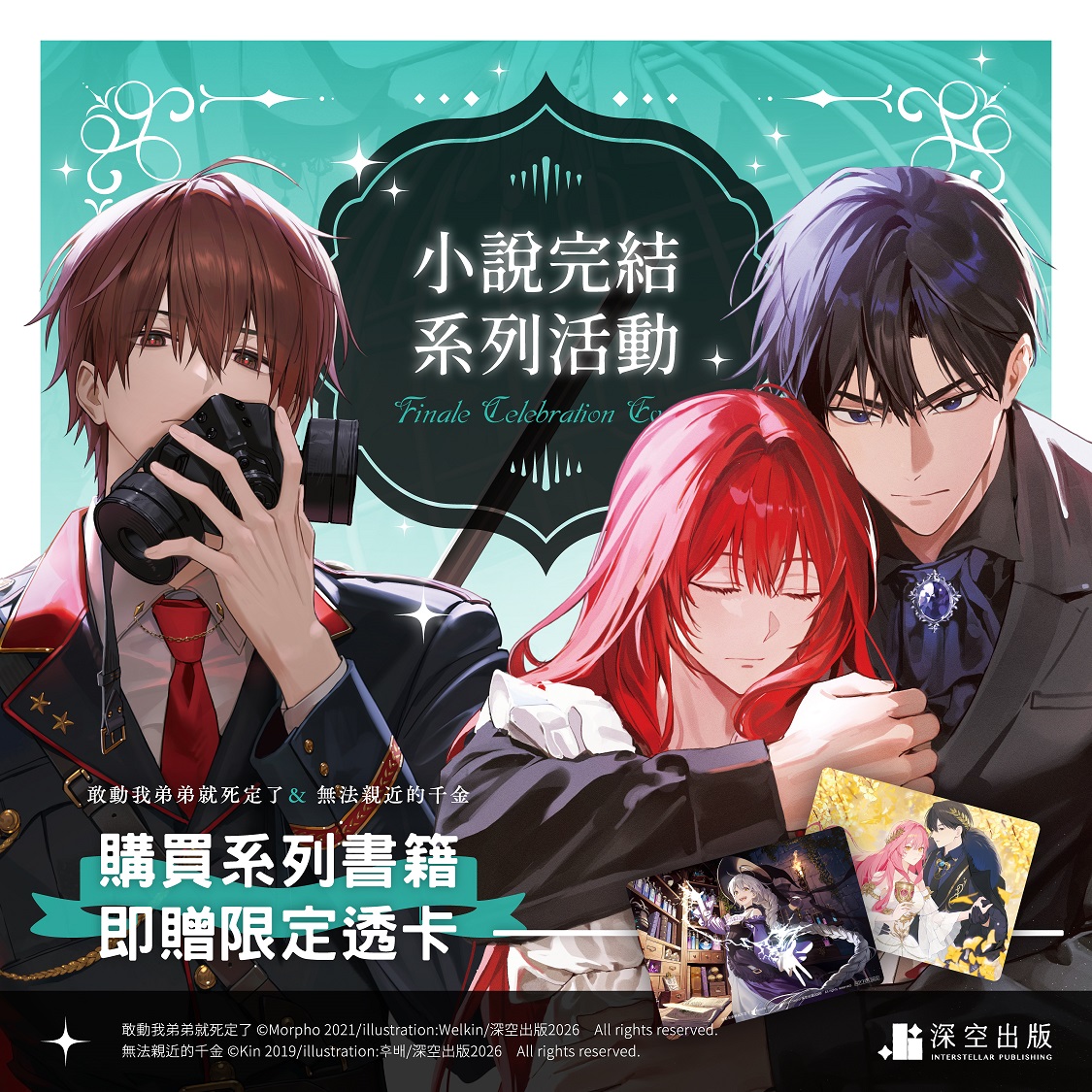 慶祝《無法親近的千金》及《敢動我弟弟就死定了》繁體中文小說完結!只要於展場購買《無法親近的千金》或《敢動我弟弟就死定了》系列任一本小說書籍(含限定版),即可獲得對應作品展場限定精美透卡乙張。