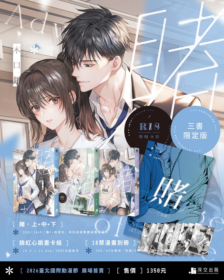 偏執陰鷙少年X單純認真少女,青澀(色)之戀的校園愛情小說《賭》三書限定版將在第十四屆台北動漫節搶先開賣!更收錄作者全新加筆番外篇,讓你三集一次收藏!