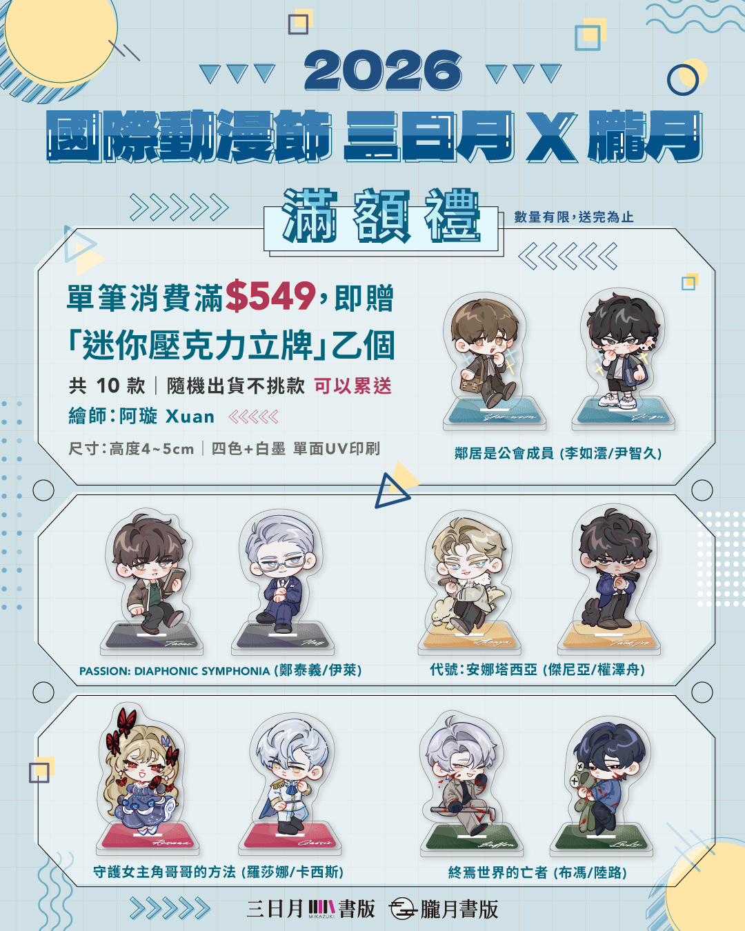 本次來場消費,單筆消費滿$549,隨機贈送「迷你壓克力立牌」乙個。總共10款,可累贈!(※贈品數量有限,送完為止)
