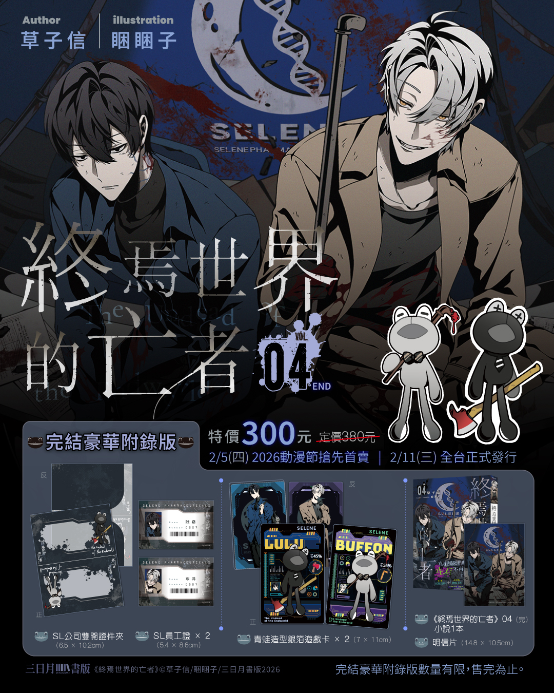 三日月書版&朧月書版也預計將於這次2026年的台北國際動漫節推出2套限定版《兩個帝國,帝國的奴隸1+2【套書限定版】(限)》、《溫熱的銀蓮花8限定版》以及備受矚目的《終焉世界的亡者04【完結豪華附錄版】》末日黑色懸疑傑作即將迎來完結篇!