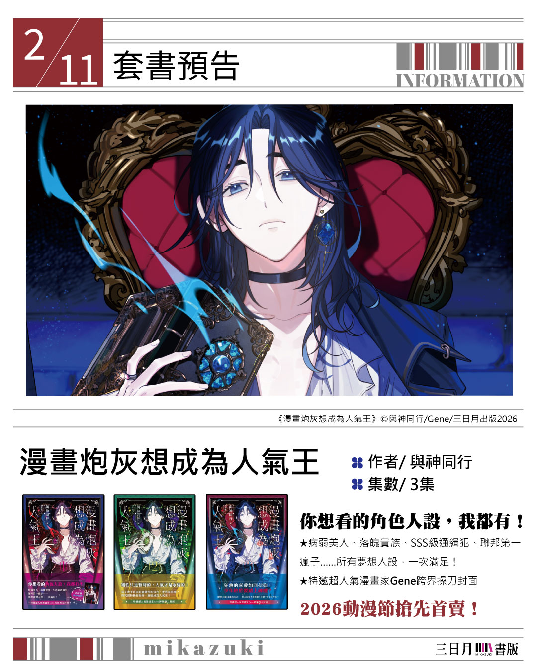 特邀超人氣漫畫家 Gene 跨界操刀封面—《漫畫炮灰想成為人氣王》1~3 集(完)也將於 2026 台北國際動漫節同步搶先上市!