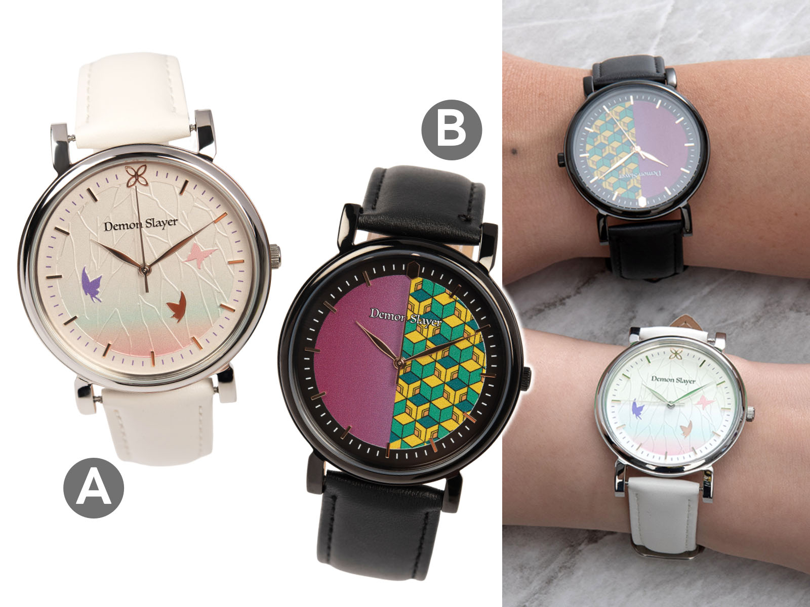 在劇場版中大活躍的蟲柱胡蝶忍、水柱冨岡義勇,也推出兩人專屬的角色腕表,設計上以各自羽織特色為主,12點鐘刻度則以日輪刀刀鍔呈現,細節滿滿;再加上真皮錶帶、不鏽鋼錶殼、藍寶石鍍膜的強化水晶玻璃,及3ATM的生活防水,收藏與實用價值都極高。
