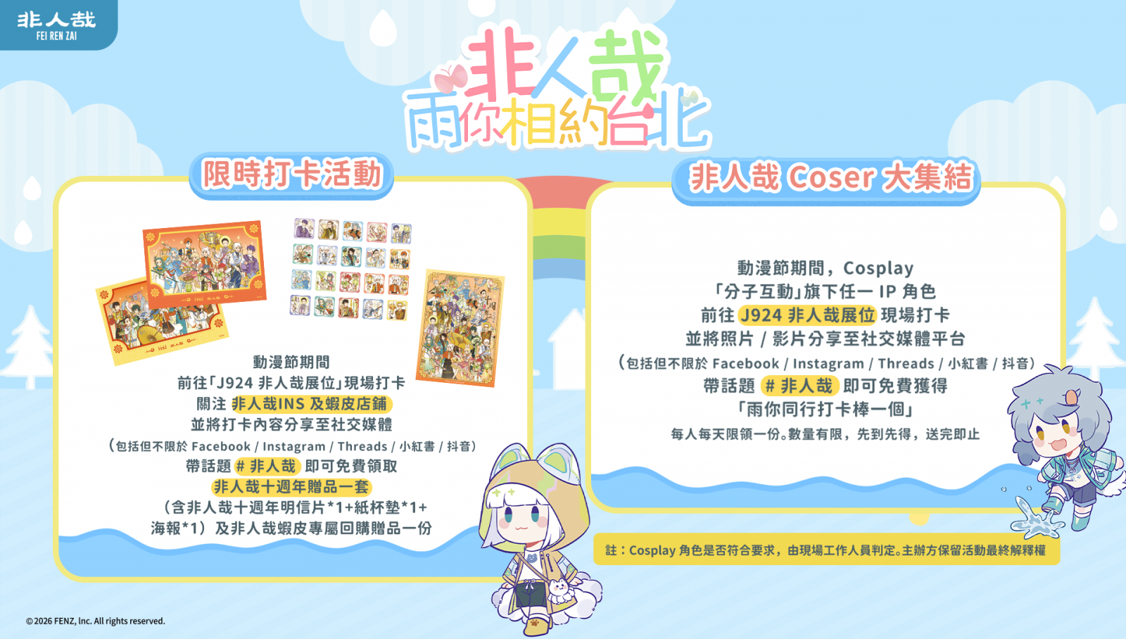 - Coser 加碼賞:若粉絲身著《非人哉》 角色 Cosplay 服裝來到攤位並完成關注任務,將額外加碼贈送「非人哉-雨你同行系列-打卡棒盲盒」乙個,同樣每天限量,送完即止!