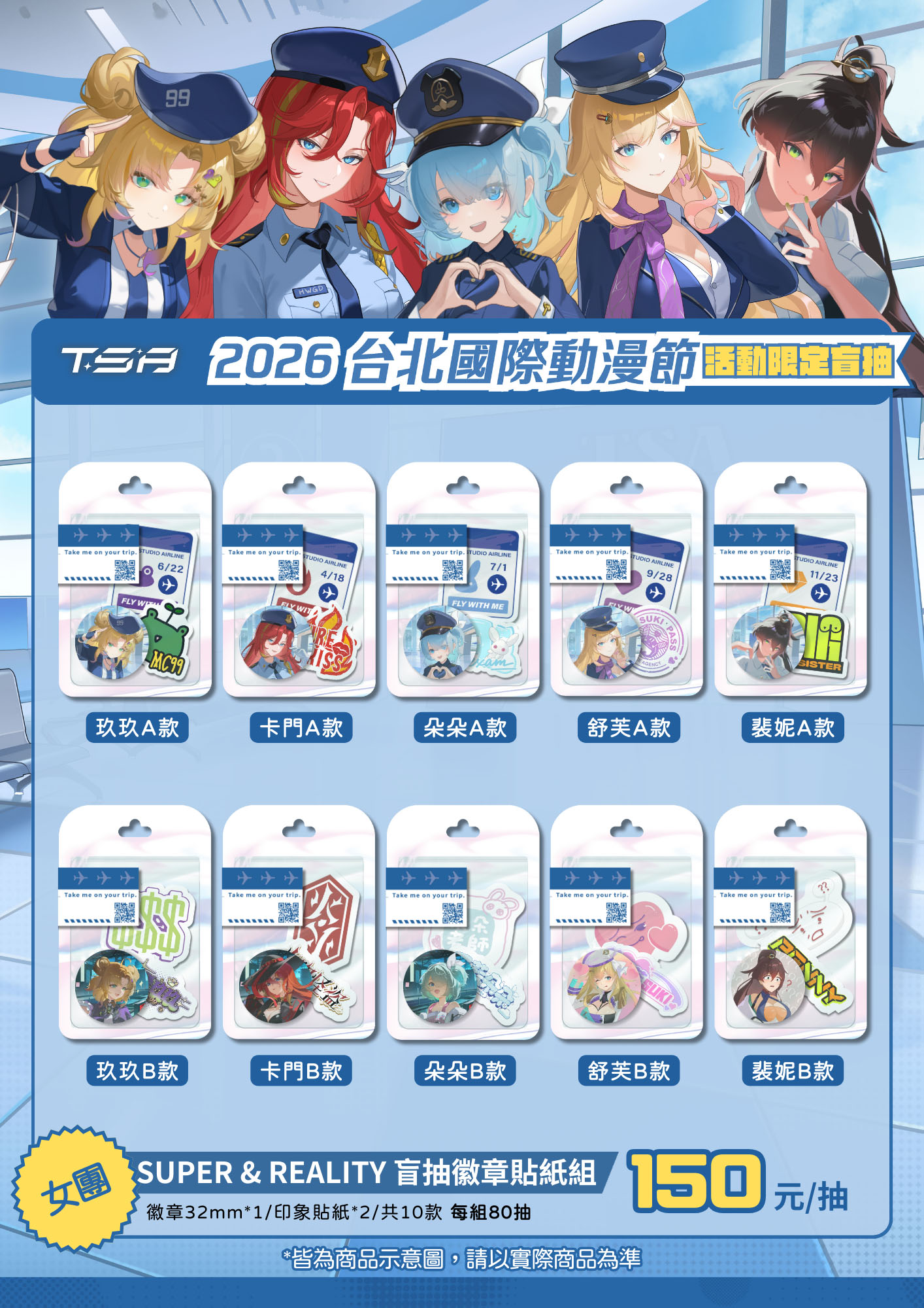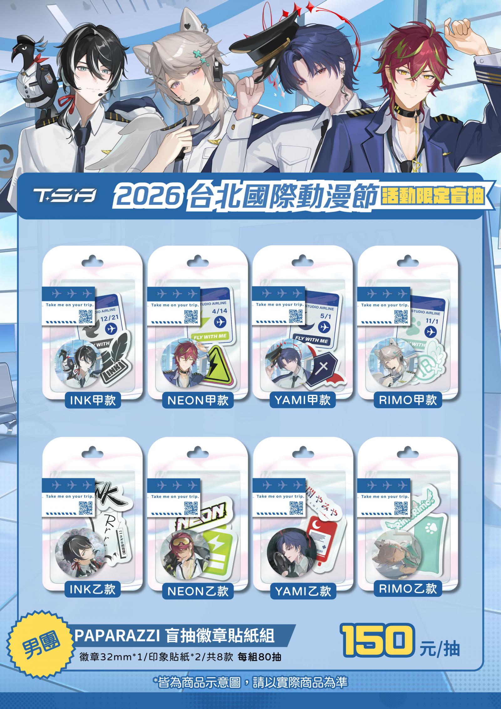 • TSA Studio 時空管制署: 推出全新「活動限定盲抽徽章貼紙組」(每抽 150 元),旗下男團 PAPARAZZI 與女團 SUPER & REALITY 全員到齊。除了享受蒐集本命的樂趣,現場更同步開賣 2026 首發新品——超豪華**「機長系列組合立牌」(1,200元)及「年度畫冊」**(700元),讓粉絲試手氣與珍藏一次滿足。