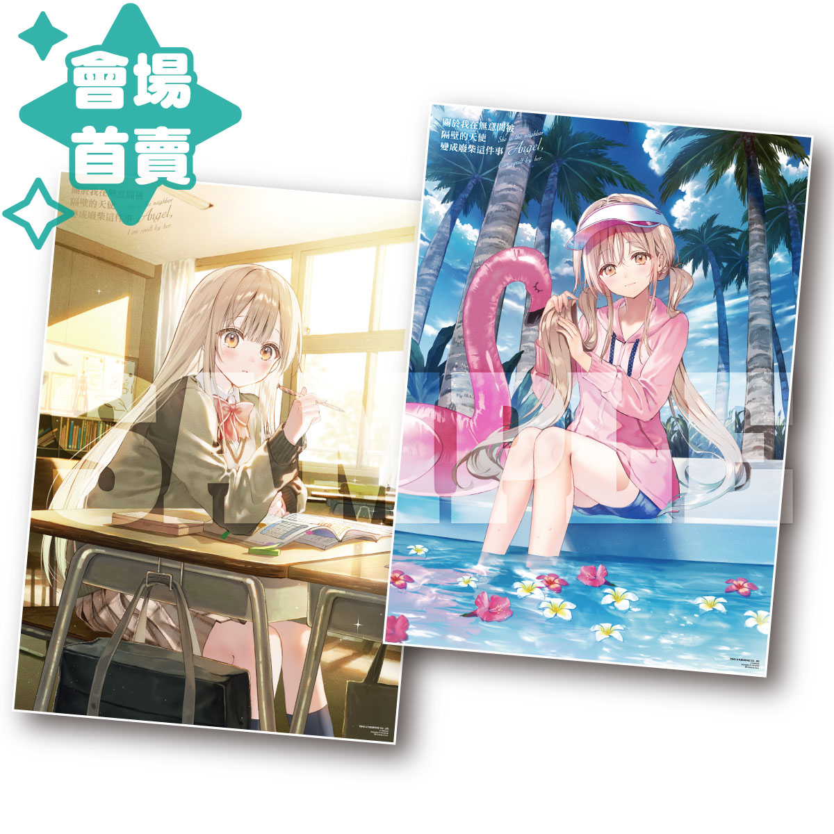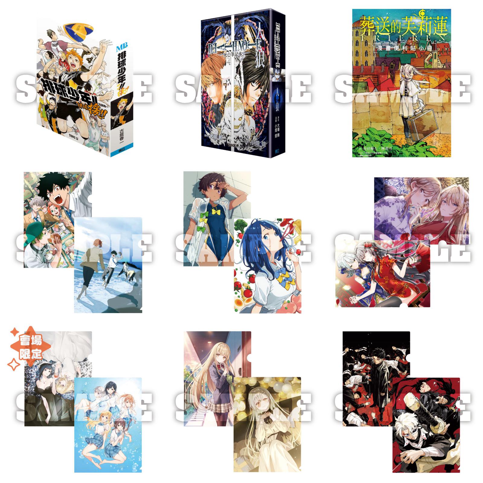 簽名會作品《惡靈剋星》除隨機商品外也推出了其他精品,以精美圖樣搭配美術紙製作的A4畫報與特別以燙金工藝加工的珍藏壓克力磚,完美呈現作者的細膩彩圖,是絕對要收藏的品項。同樣為簽名會作品的《敗北女角太多了!》則是有以精美圖樣搭配美術紙製作的A4畫報,再加上以作品內文藝社社刊為發想的筆記本,還原作品細節外更挑選了可愛的彩圖,收藏性與實用性並具。大受矚目的校園戀愛作品《關於我在無意間被隔壁的天使變成廢柴這件事》將發行以特殊工藝製成的A3海報組,一張為銀箔材質,另一張則為PP材質,絕對值得收藏!最後,當季熱門動畫《葬送的芙莉蓮》則是史無前例地推出會場加購商品,以大尺寸製作的特製畫板,所選圖面具有意義之外,更特別申請了兩位作者的複製簽名置於畫板上,只要現場購買《葬送的芙莉蓮》系列書籍或商品即可加購!