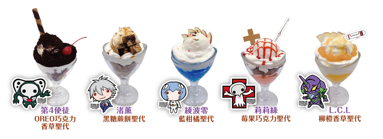 《MyAnime Café》x《新世紀福音戰士EVANGELION》本次推出5道主餐,嚴選健康食材調理,推出初號機的堅果碧翠冷麵、零號機的起司醬光頭堡、2號機的起司蕃茄焗烤筆管麵、8號機的甜菜根粉紅咖哩,均以機體為設計意象,另外加入YURUSHITO主題的可愛黑咖哩飯,點餐贈送專屬寫真卡。而甜點、聖代、飲料,均全力呈現每位角色的意象,享用聖代和甜點均贈送專屬Q版軋型卡,給你另一種EVA風味!而本次推出以角色調配的10杯飲品,除了主要角色的清涼冷飲之外,最大特色是具有大人風味的創意特調,包含葛城美里的麥芽啤酒風味氣泡飲及碇源堂的威士忌風味可樂,喝起來不只有轉大人的感覺,最重要的是完全不含酒精,未成年也能安心飲用。外帶或內用飲品均附贈PP材質隨機杯墊,歡迎粉絲挑戰特典全制霸!
