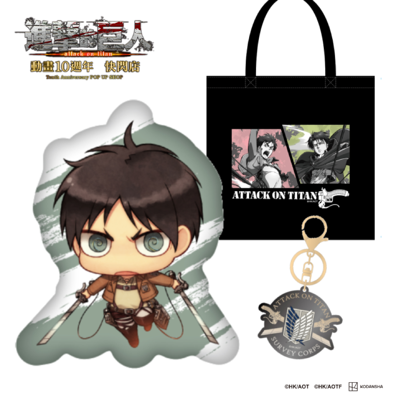 《進擊的巨人》動畫10週年快閃店更推出了限量福袋與滿額活動!有限量的《進擊的巨人》開幕福袋,裡面有艾連的Q版造型抱枕、黑色酷帥帆布包以及調查兵團團徽吊飾,全品項皆是為了這次快閃店特別限量製作價格只要$880,數量有限售完不補!