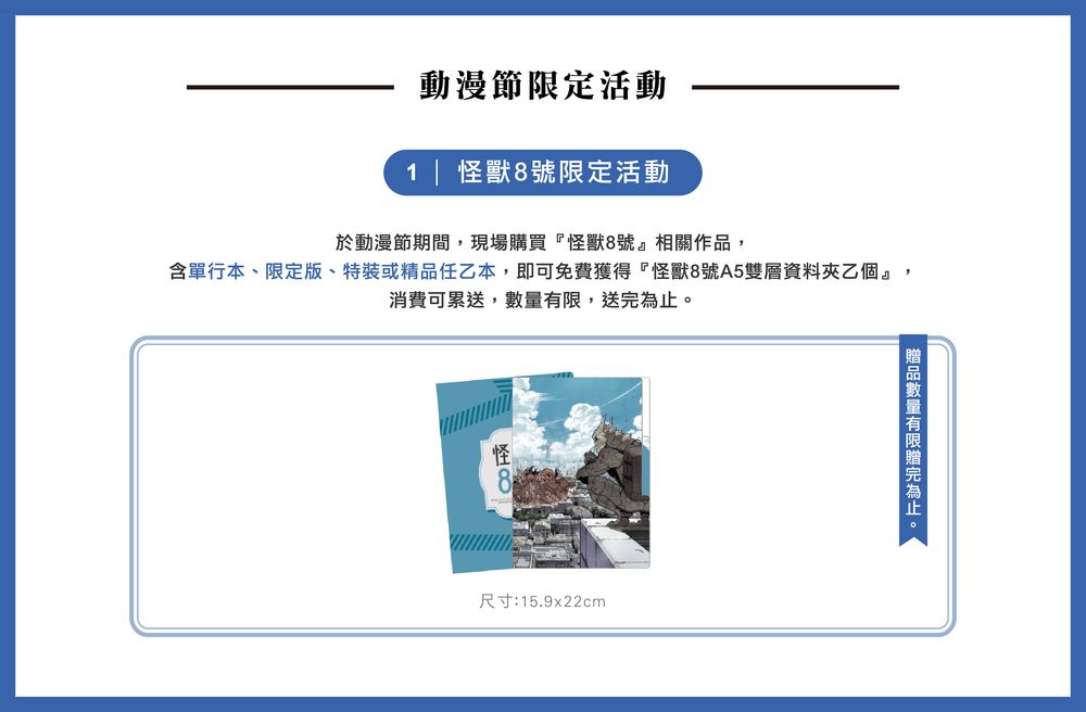 於長鴻會場購買《怪獸8號》相關作品(含單行本、限定版、特裝版或精品)任乙本,即可獲得『怪獸8號A5雙層資料夾』乙個,單筆消費可累送,贈完為止。